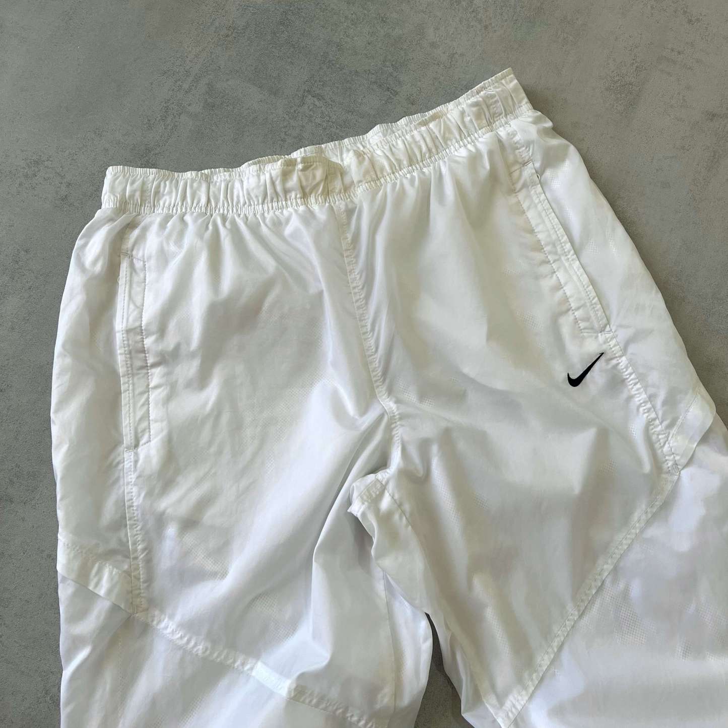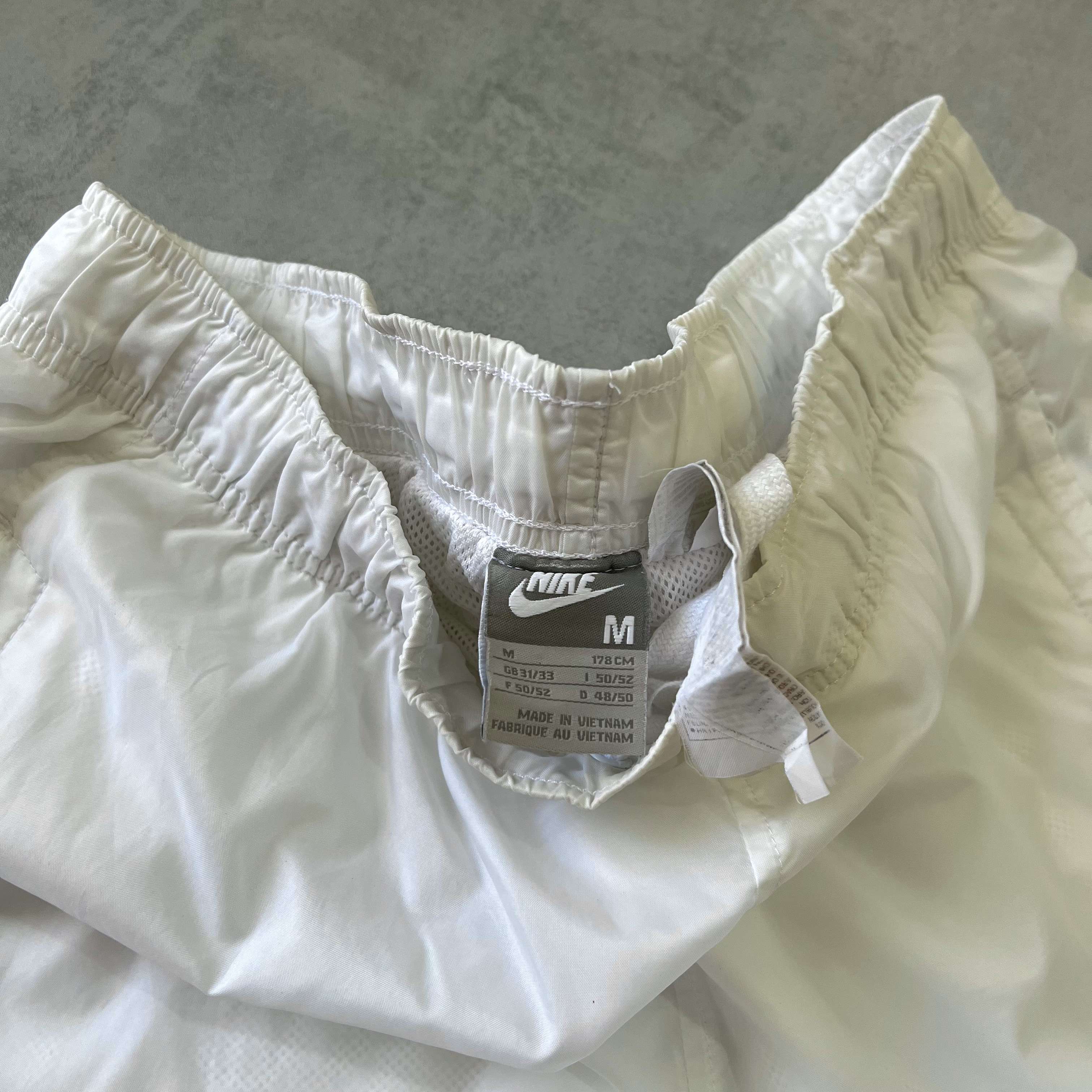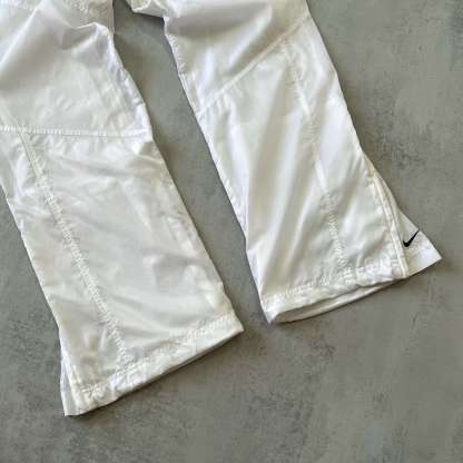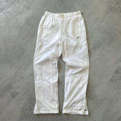I pantaloni Nike degli anni 90 rappresentano un'icona di stile sportivo e funzionalità, perfettamente in linea con l'estetica di quel decennio. Realizzati prevalentemente in tessuti tecnici come il nylon o il poliestere, si distinguono per il loro taglio ampio e rilassato, con elastici in vita e alle caviglie che ne accentuano la praticità. Spesso arricchiti da tasche laterali con zip e dettagli riflettenti, questi pantaloni incarnano lo spirito dello streetwear e dell'athleisure di quegli anni. I colori spaziano dal classico nero a tonalità più vivaci, con il logo Nike, ricamato o stampato sulla gamba, che aggiunge un tocco distintivo e riconoscibile.