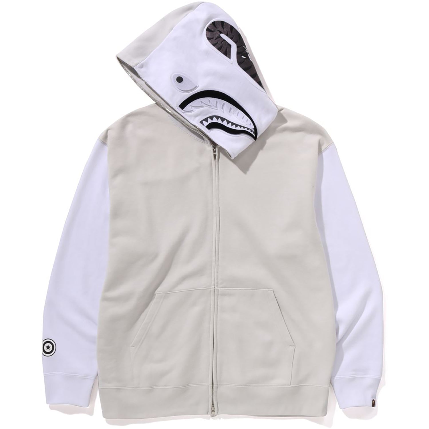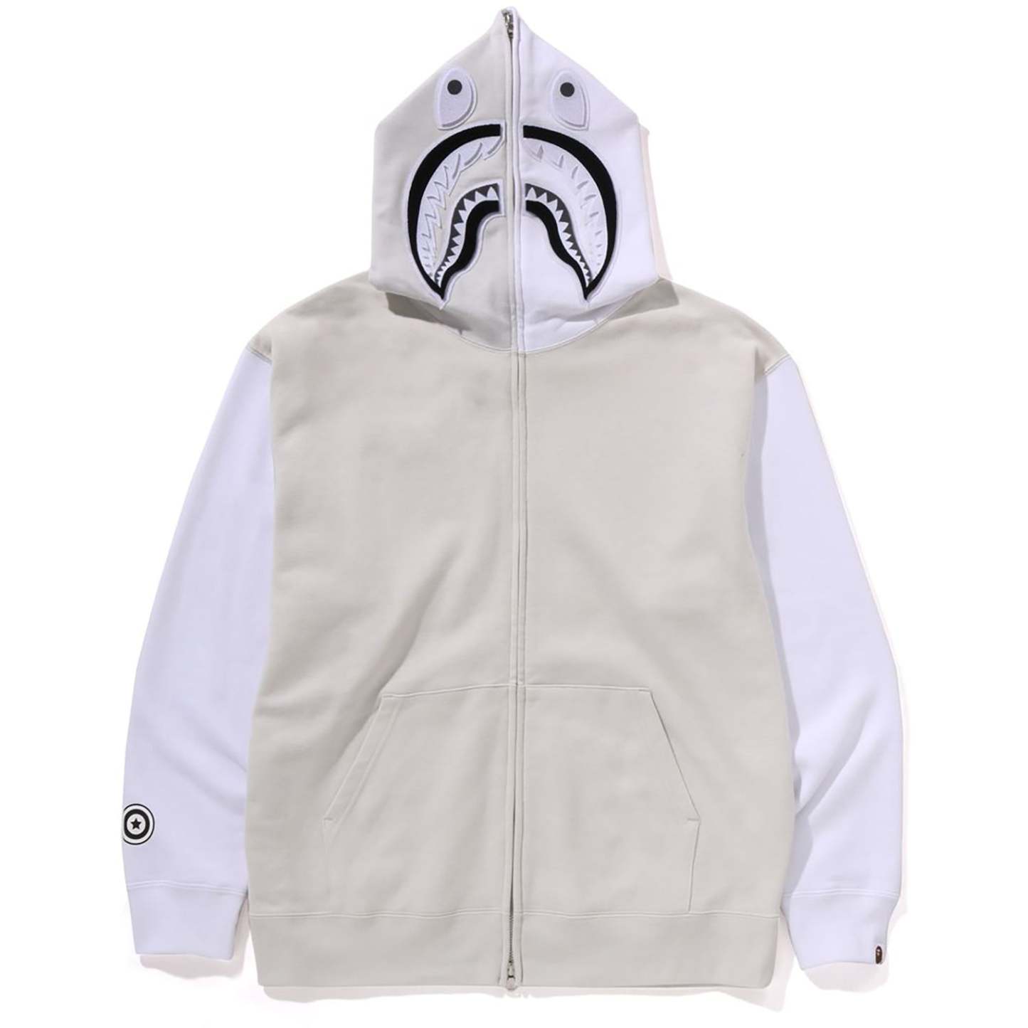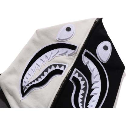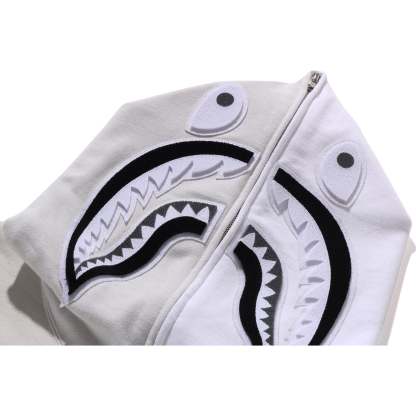 BAPE MENS COTTON SHARK FULL ZIP HOODIE JACKET #1 features a soft brushed cotton fleece lining for comfort, adorned with a distinctive SHARK motif appliqué. It offers a relaxed fit with a zip closure and displays the Frankenstein logo name on the back, combining style and ease for everyday wear.