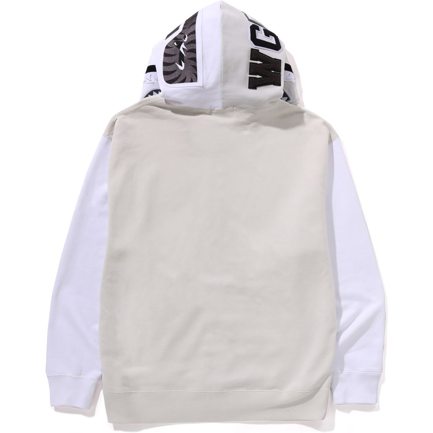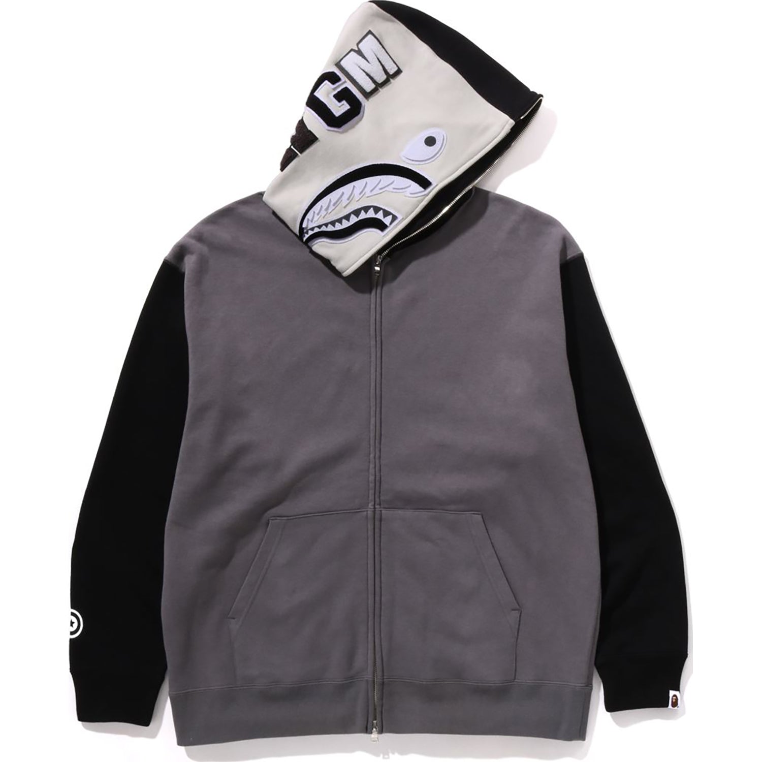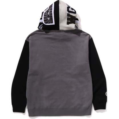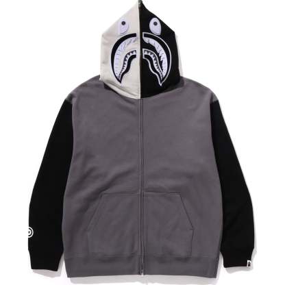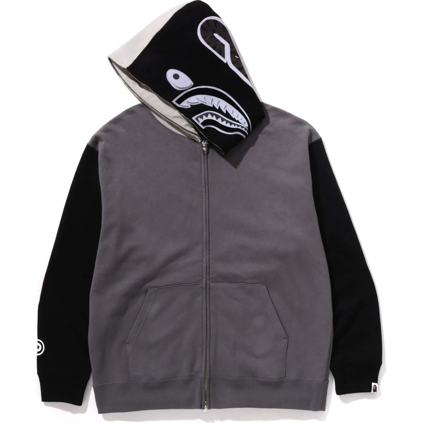 BAPE MENS COTTON SHARK FULL ZIP HOODIE JACKET #1 features a soft brushed cotton fleece lining for comfort, adorned with a distinctive SHARK motif appliqué. It offers a relaxed fit with a zip closure and displays the Frankenstein logo name on the back, combining style and ease for everyday wear.