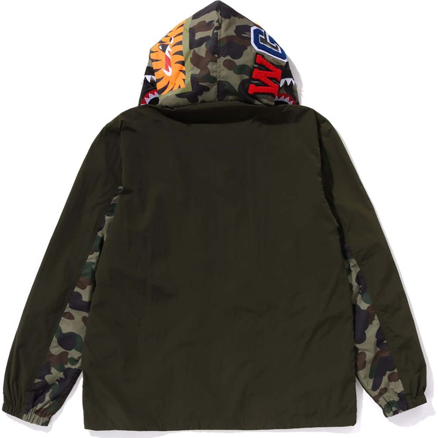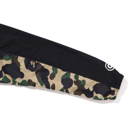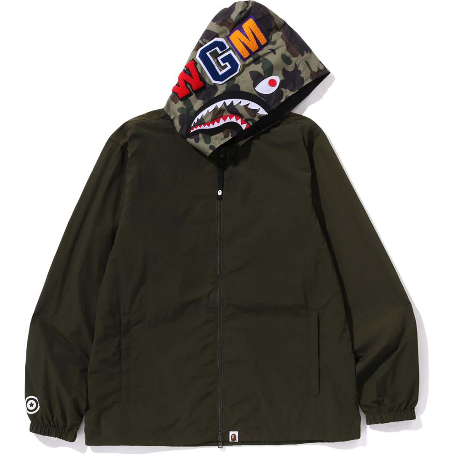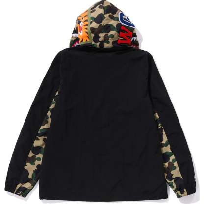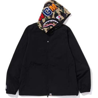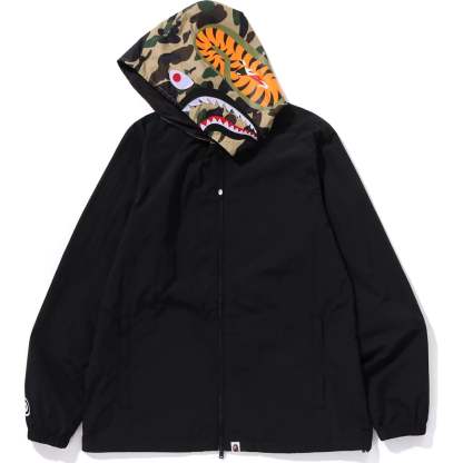 This hoodie jacket features a regular fit with a zip closure, showcasing the iconic 1ST CAMO shark motif and Sagara patch. It includes APE HEAD and name tags for added style. Comfortable and stylish for everyday wear.