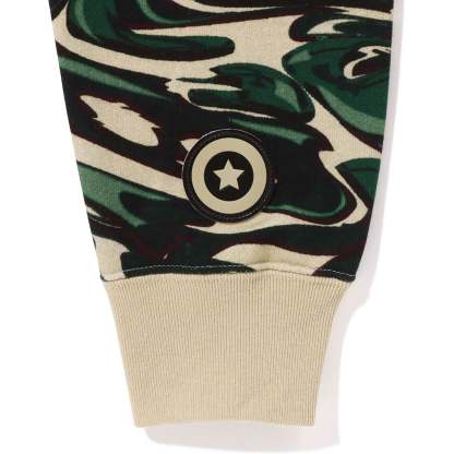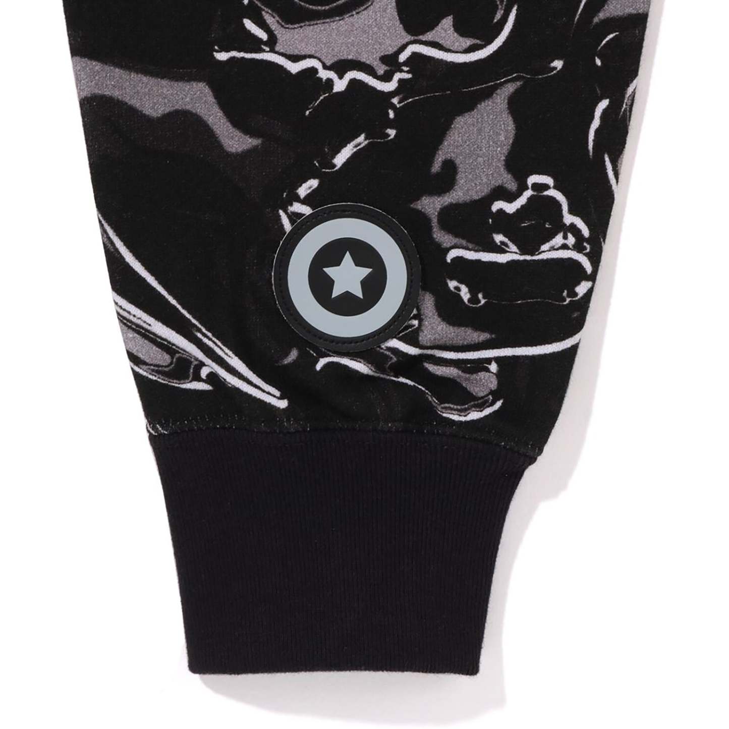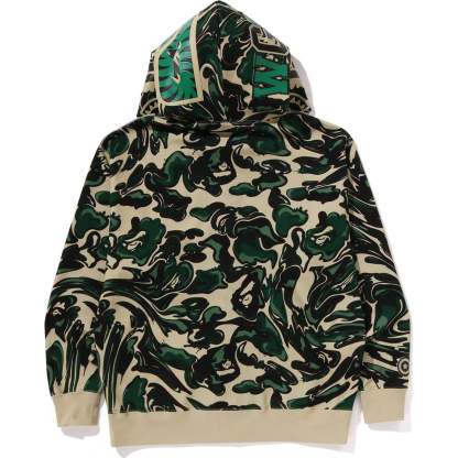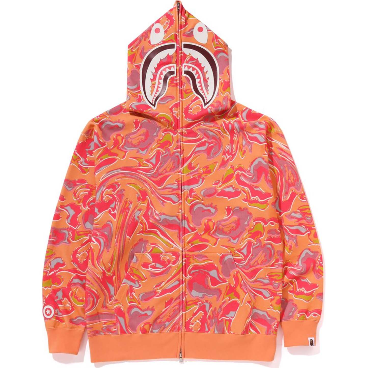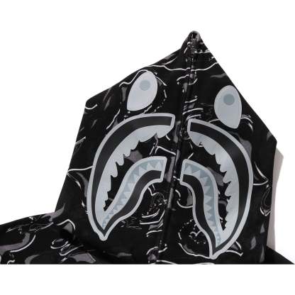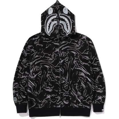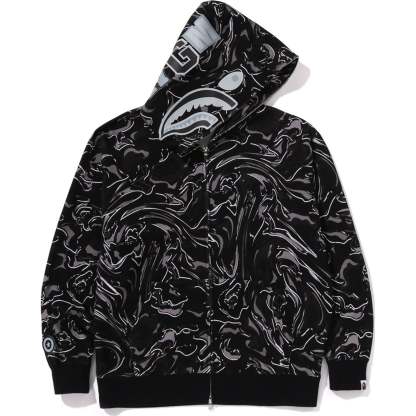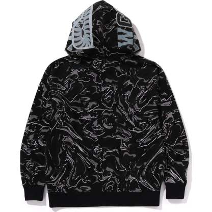 This zip-up hoodie features a comfortable cotton fleece fabric with a unique marbling camo print. It includes distinctive patches like the shark on the hood and a roomy fit for easy movement. Perfect for casual wear with style and comfort.