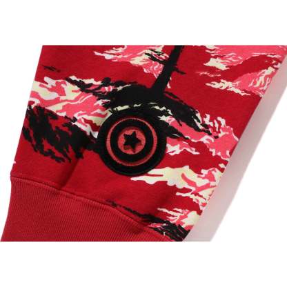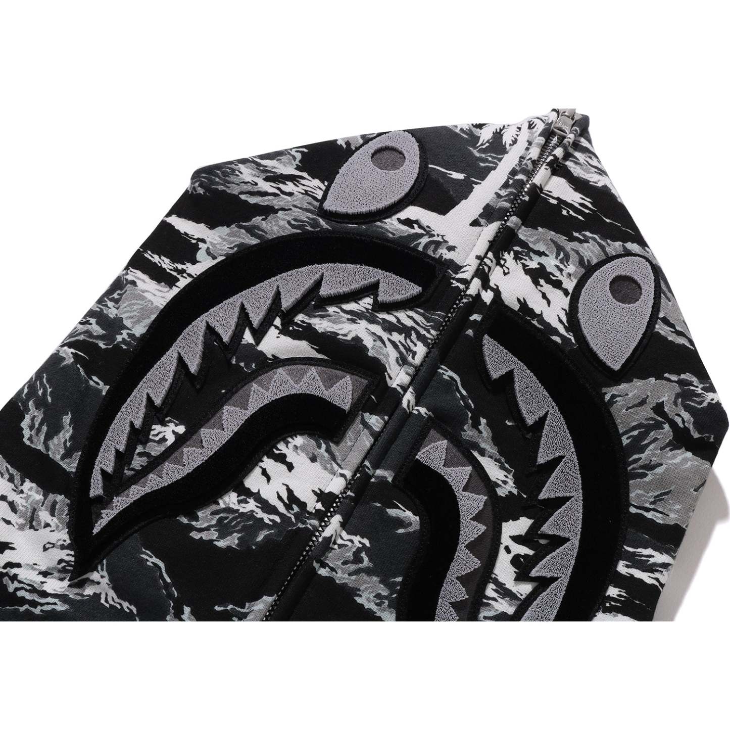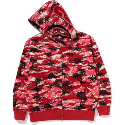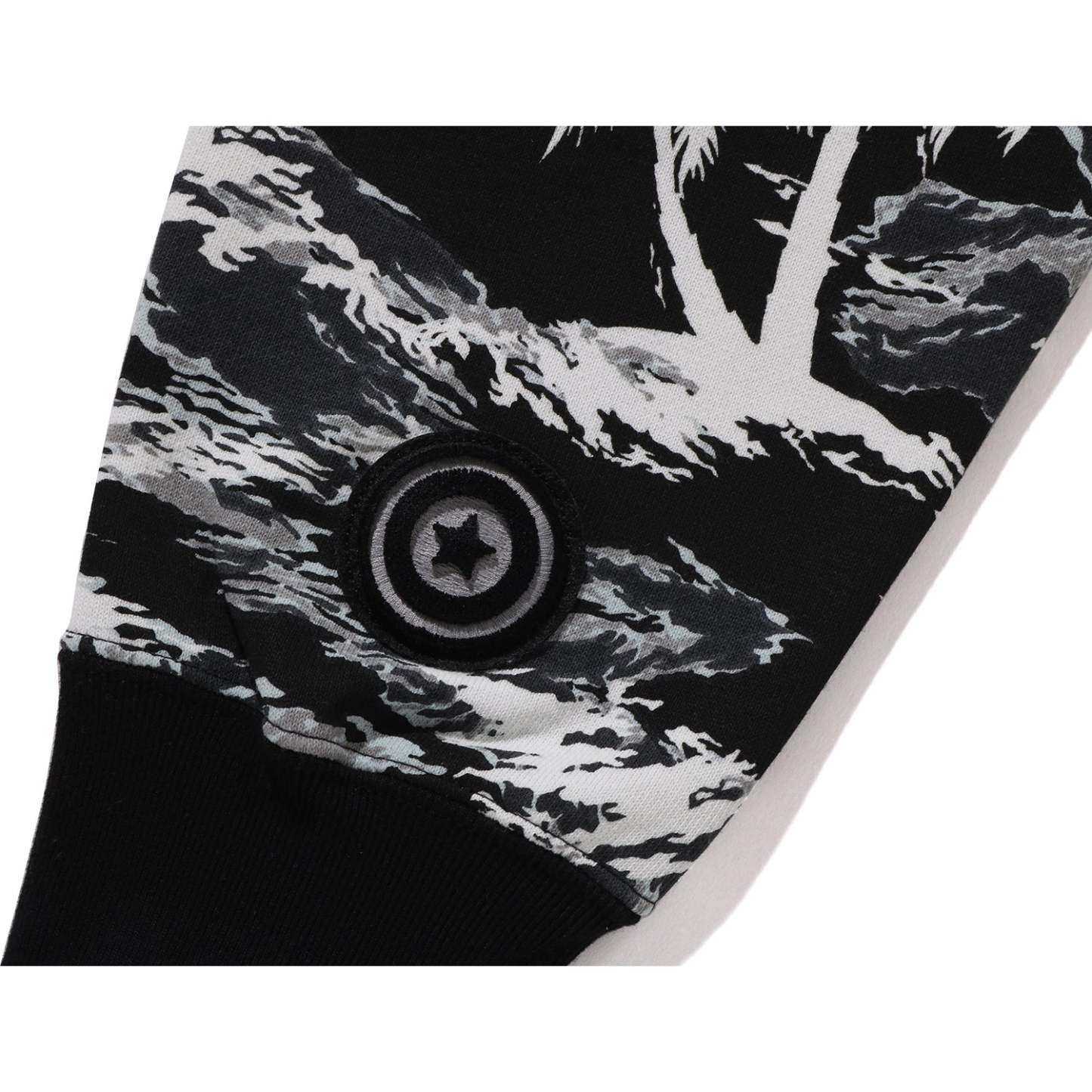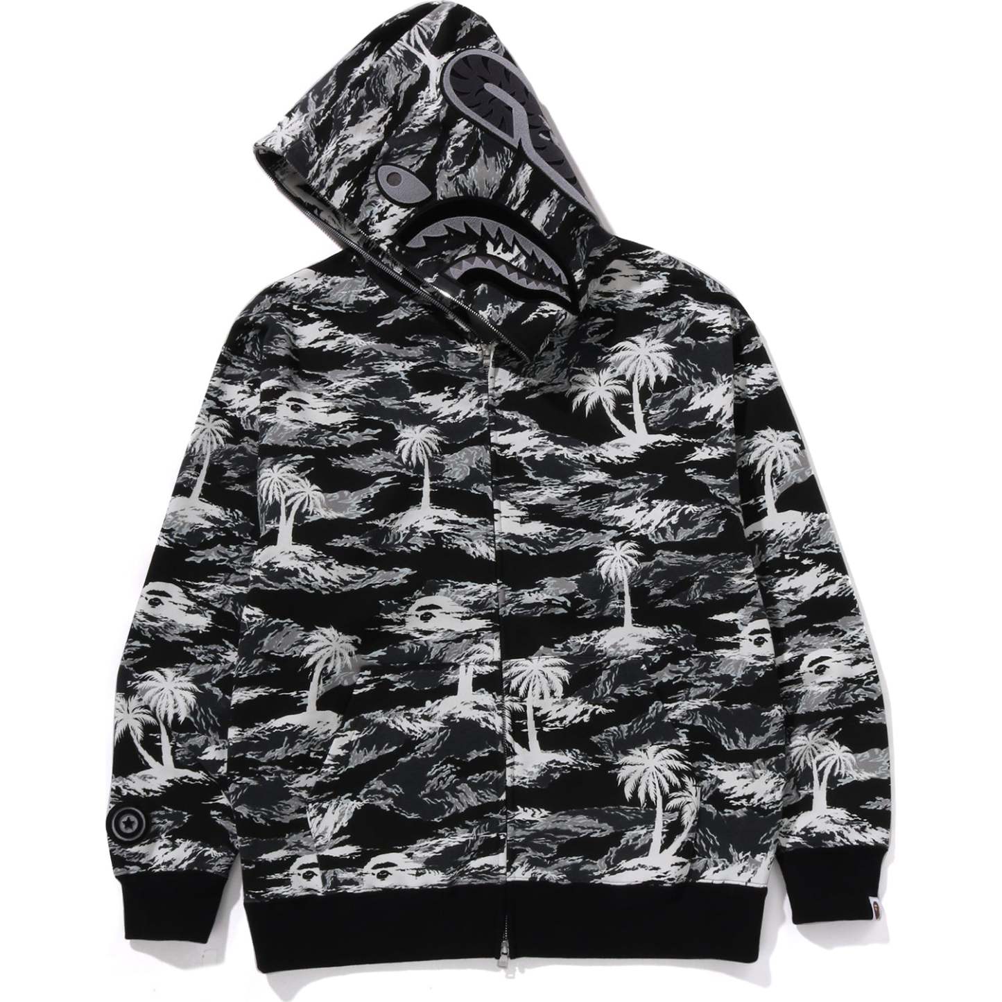 The A BATHING APE Spring/Summer 2025 hoodie features the new PALM TREE CAMO pattern, blending tiger camo with palm trees. It has a full zip, a shark patch on the hood, and a soft fleece lining for warmth. The relaxed fit offers comfortable wear.