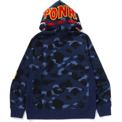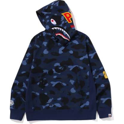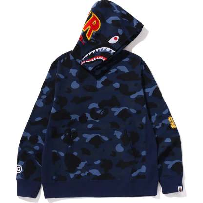 BAPE MENS COTTON COLOR CAMO 2ND SHARK PULLOVER HOODIE SWEATSHIRT is constructed for enhanced comfort, this hoodie features a unique SHARK motif patch on the hood and a regular fit silhouette. Offered in Purple, Navy, and Red, it is available in sizes S through 2XL, making it an ideal choice for the fall season.