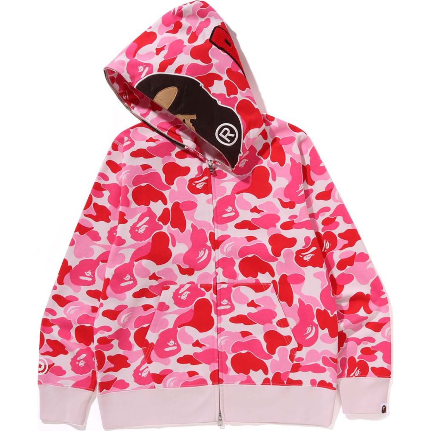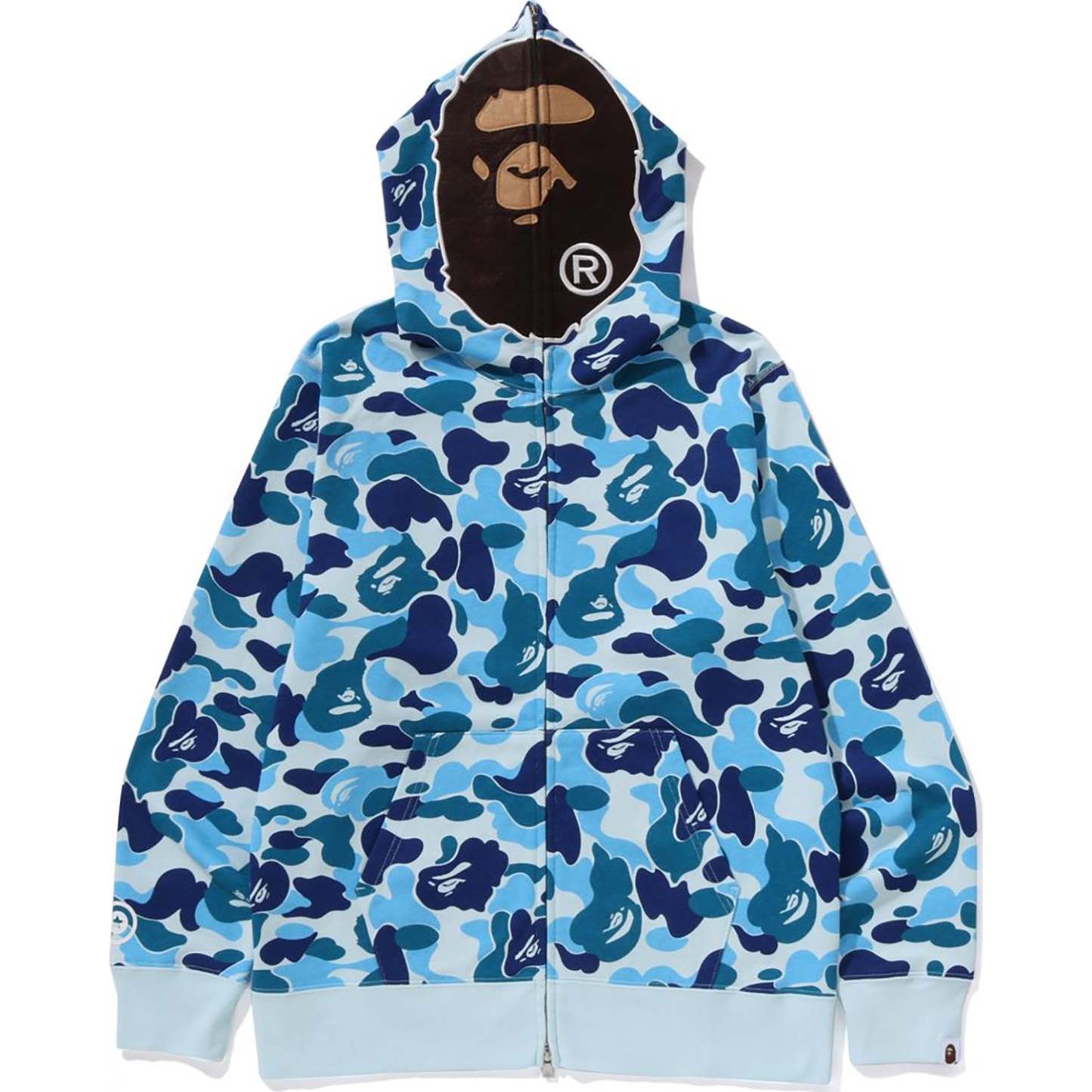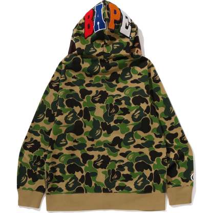 The BAPE Men's Cotton ABC CAMO 2ND APE Full Zip Hoodie Jacket offers a full-zip design with a soft brushed lining and distinctive ABC CAMO pattern. It features a unique 2ND APE motif patch on the hood and a kangaroo pocket for added convenience, all presented in a comfortable regular fit silhouette.
