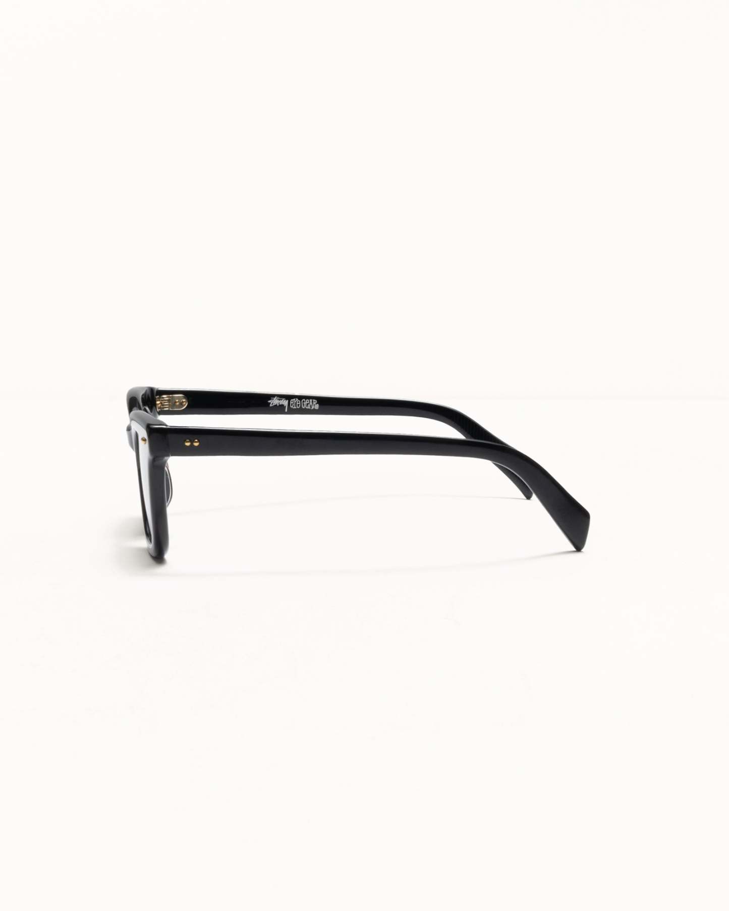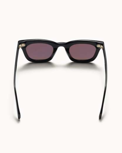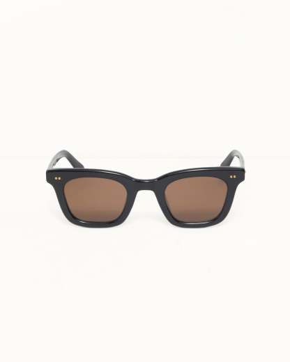 Thick square frames with a wide profile and metallic dome studs at each side. Handmade in black bio-acetate with brown tinted recycled lenses. Features laser-engraved logo detailing at the lens corner.
