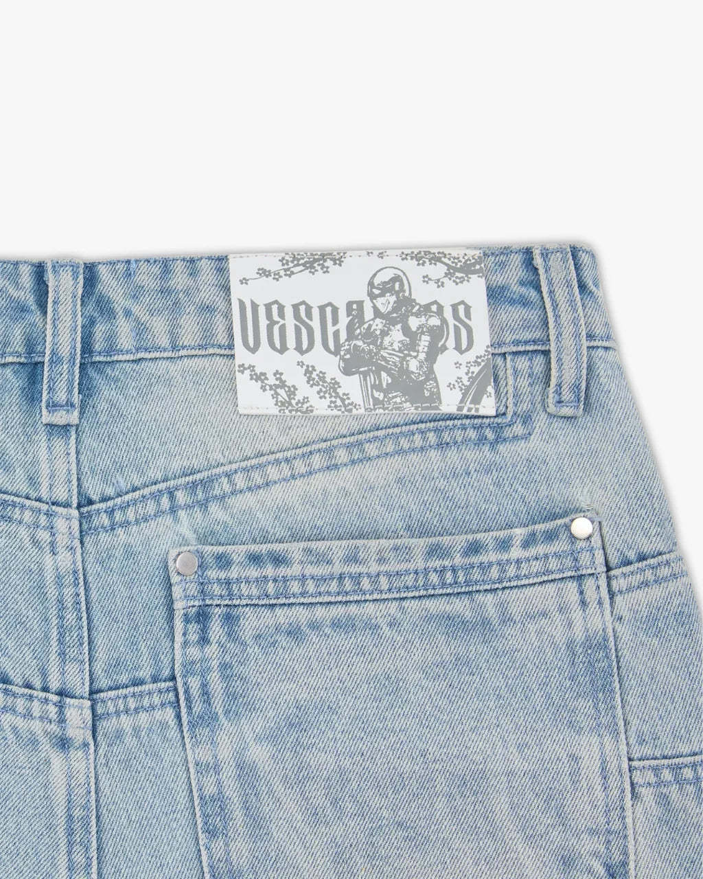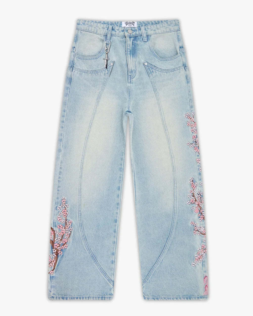 Crafted in a washed light blue finish with custom panelling on the front and back. Back embroidery depicting a knight beneath a blooming cherry blossom tree, with branches extending to the front panels. Finished with a custom leather tab, metal sword carabiner & 1,000,000+ stitches.