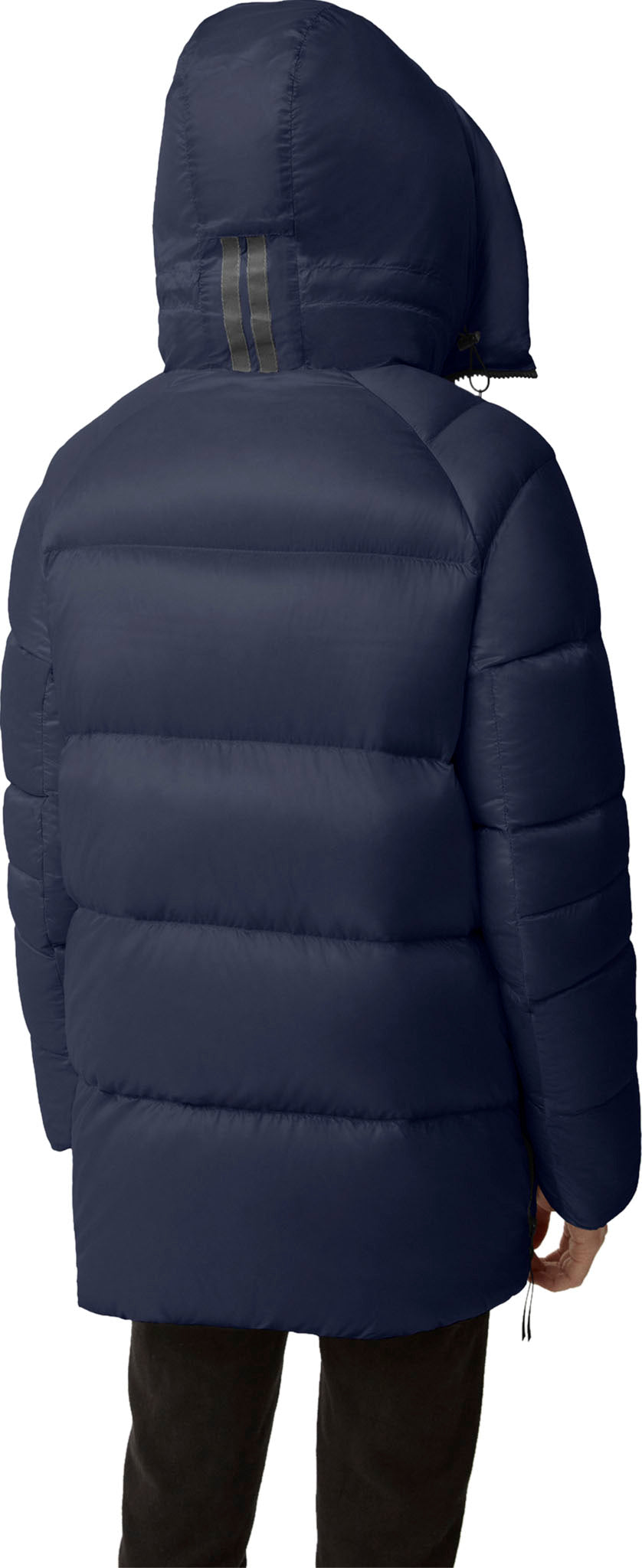• Down-filled adjustable hood with cordlock adds warmth and element protection. Signature double-stripe black reflective details at the back add visibility in low light