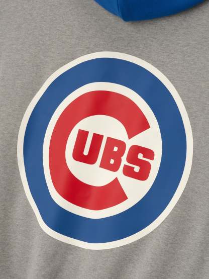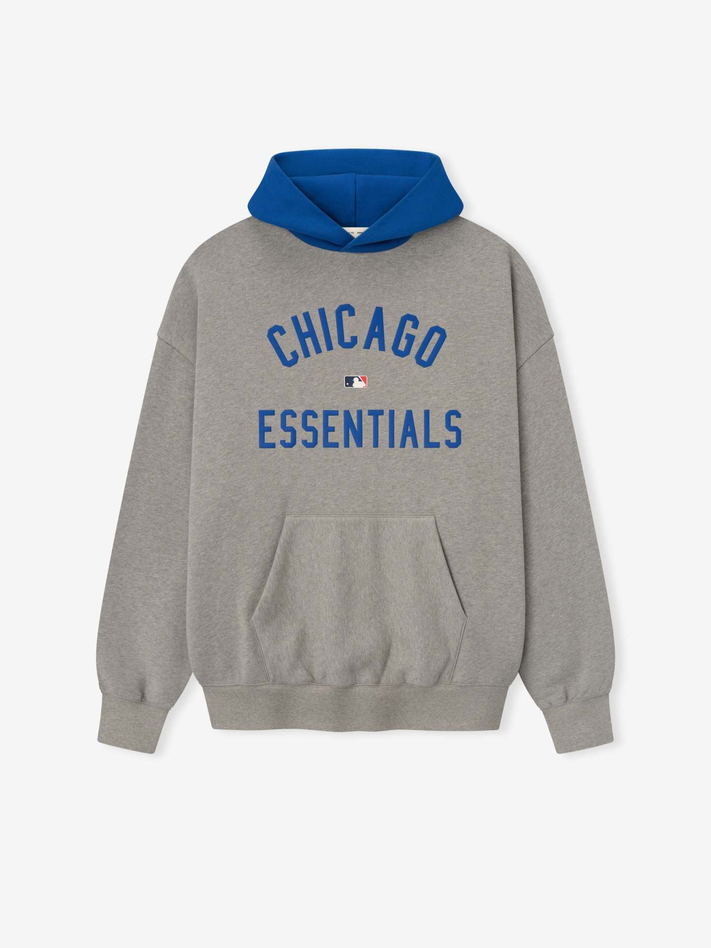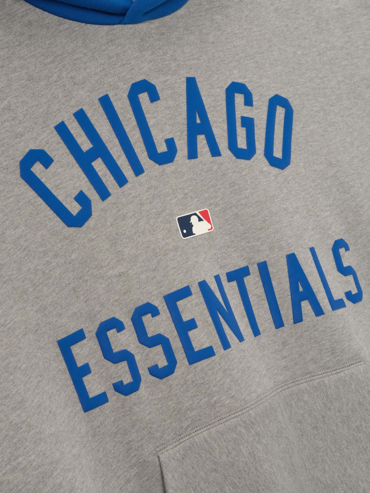 The Cubs Sports Hoodie is crafted from core fleece, offering an elevated balance of softness, structure, and lasting comfort. Cut in a relaxed sport fit, it drapes with more ease through the body and extended length compared to the Essentials classic silhouette. The front features a bold puffer-print graphic reading "Chicago Essentials" alongside the official MLB insignia, while the back is finished with the authentic Cubs logo. Additional features include a contrasting hood, kangaroo pocket, elastic bindings at the cuffs and waist hem. The signature rubberized Fear of God Essentials label accents the hood.