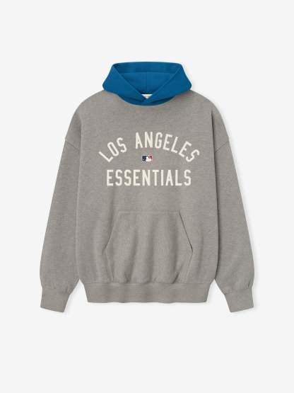 The Dodgers Sport Hoodie is crafted from core fleece, offering an elevated balance of softness, structure, and lasting comfort. Cut in a relaxed sport fit, it drapes with more ease through the body and extended length compared to the Essentials classic silhouette. The front features a bold puffer-print graphic reading "Los Angeles Essentials" alongside the official MLB insignia, while the back is finished with the authentic "LA" Dodgers logo. Additional features include a contrasting double-layered hood, kangaroo pocket, rib-knit at the cuffs and waist hem. The signature rubberized Fear of God Essentials label accents the hood.