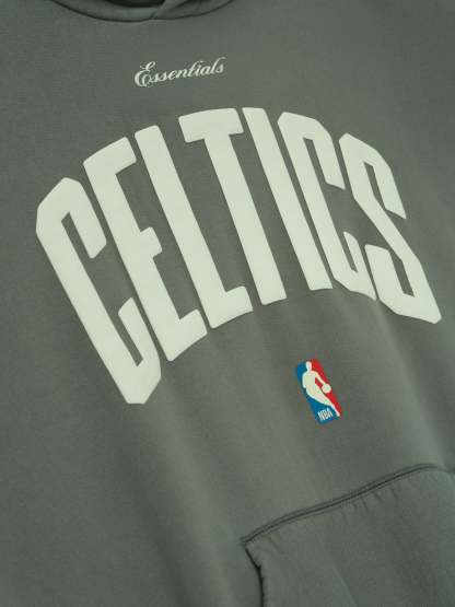 The Celtics 90s Hoodie is crafted from pigment-dyed, heavyweight 520gsm cotton fleece, delivering a softly faded vintage feel in a relaxed, ’90s-inspired fit. The front features a bold puff-print “ESSENTIALS CELTICS” graphic alongside the official NBA logo. Additional details include a kangaroo pocket, rib-knit cuffs and hem, and a signature rubberized Fear of God Essentials label accenting the hood.