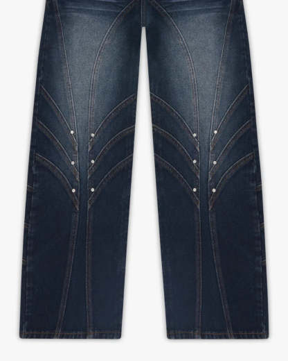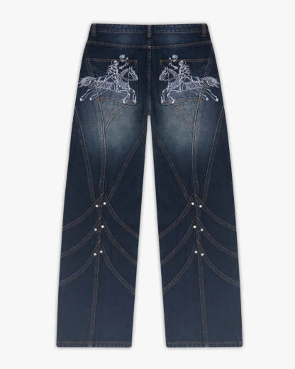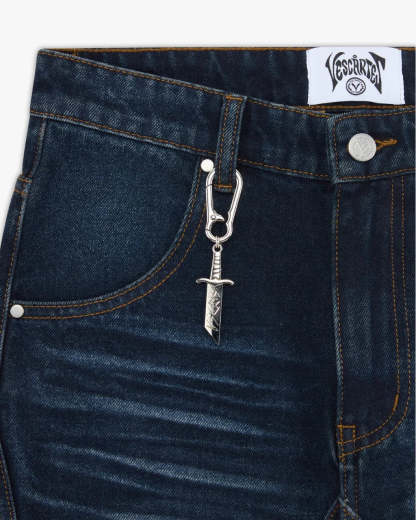 Inspired by medieval knights, this denim features front and back panelling finished with metal rivets at each intersecting seams. Subtle thigh fade w/ dark indigo wash. Embroidery of jousting knights on the back pockets. Custom sword-shaped carabiner, engraved with the Vescartes name.