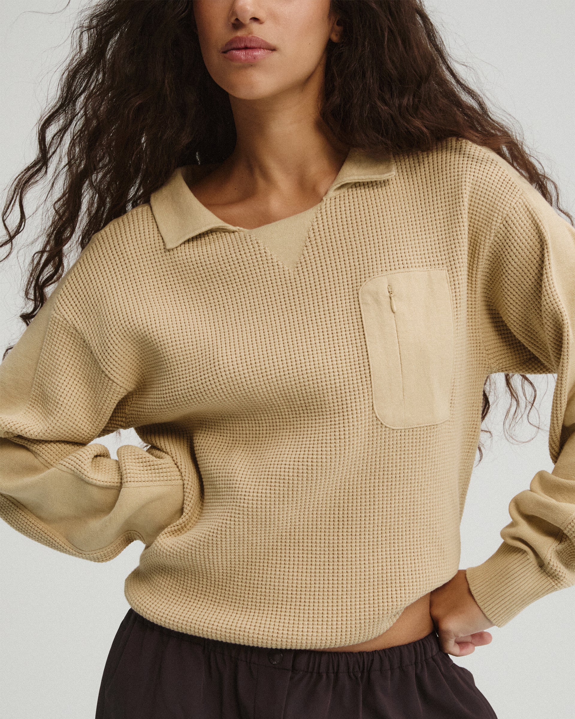 The Knit Panelled Pocket Sweatshirt is a timeless wardrobe essential. It has a relaxed open collar and a knit panelled pocket. Wear yours with the Ultimate Leggings for laid back days.