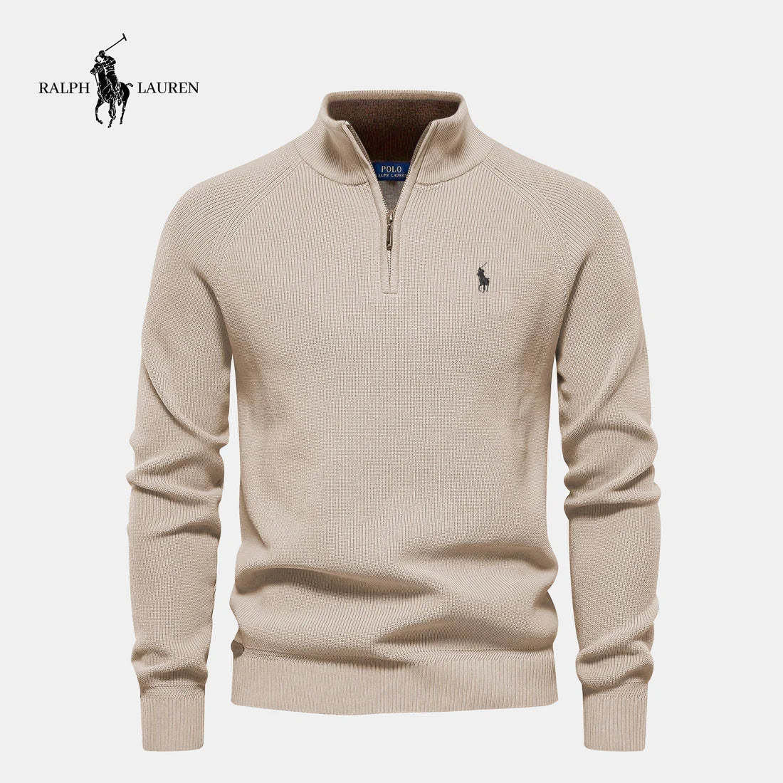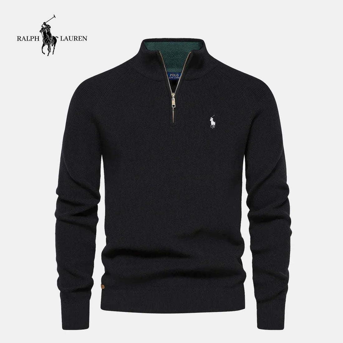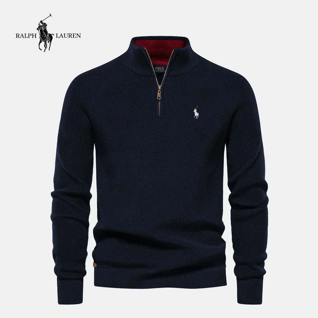 The iconic white Polo pony embroidery at the left chest signals authenticity and heritage. Ribbed cuffs and hem maintain shape and durability, while the metallic zipper with leather pull tab underscores its premium construction.