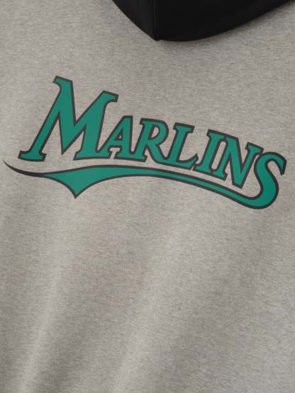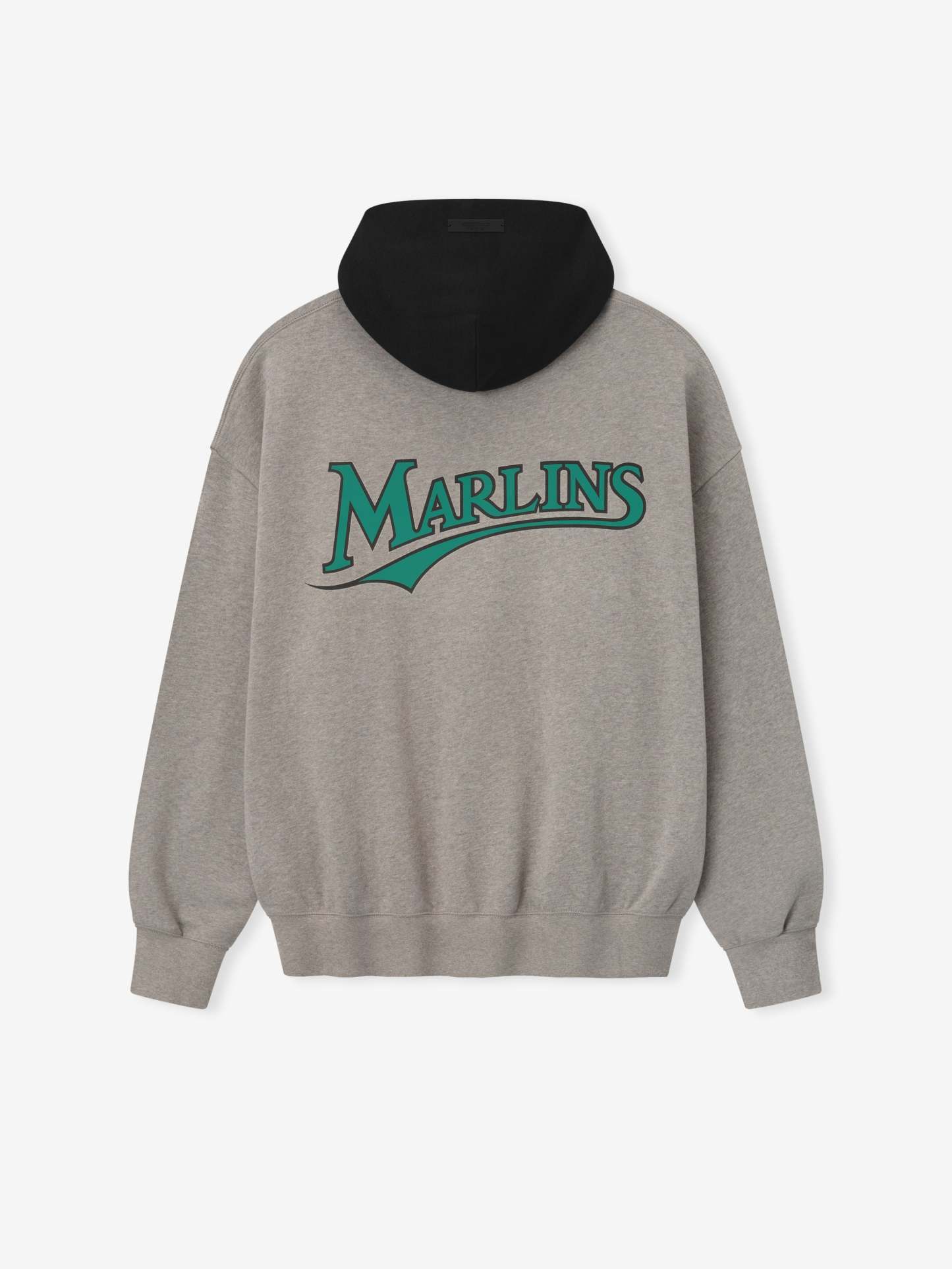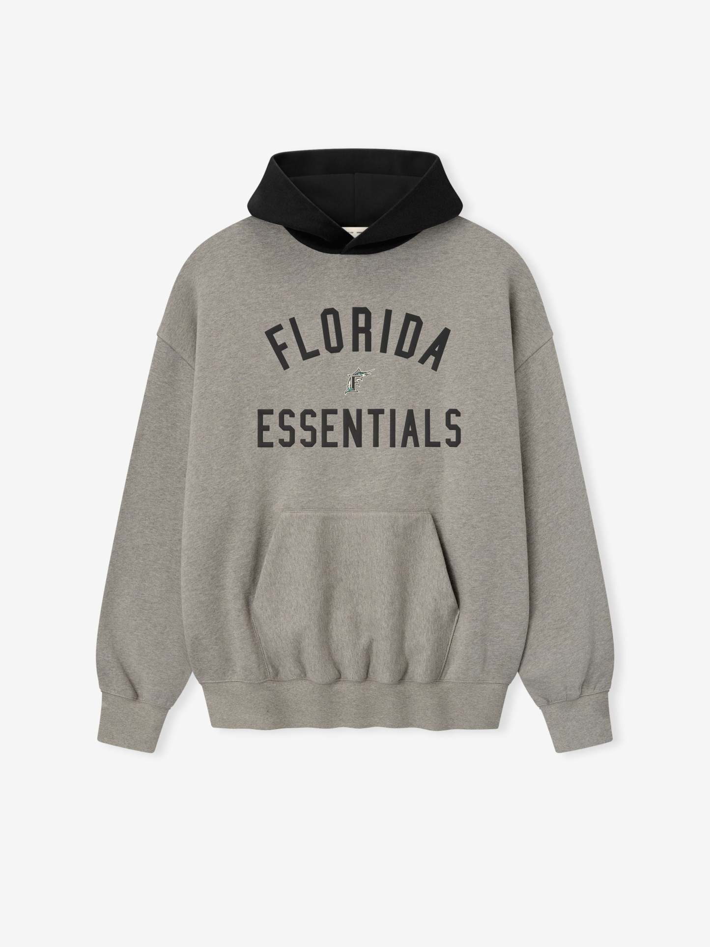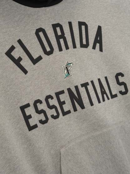 The Marlins Sport Hoodie is crafted from core fleece, offering an elevated balance of softness, structure, and lasting comfort. Cut in a relaxed sport fit, it drapes with more ease through the body and extended length compared to the Essentials classic silhouette. The front features a bold puffer-print graphic reading "Florida Essentials" alongside the official MLB insignia, while the back is finished with the authentic Marlins logo. Additional features include a contrasting hood, kangaroo pocket, rib-knit at the cuffs and waist hem. The signature rubberized Fear of God Essentials label accents the hood.