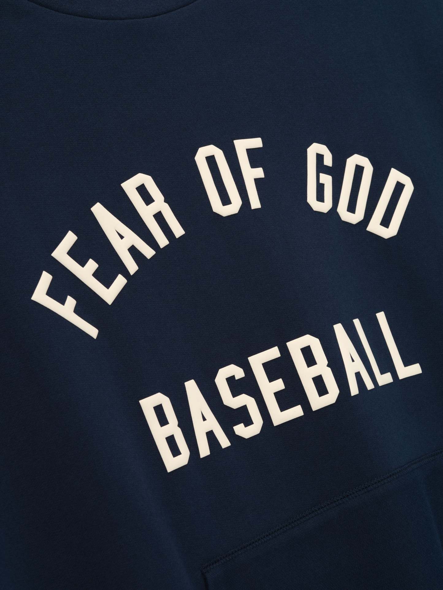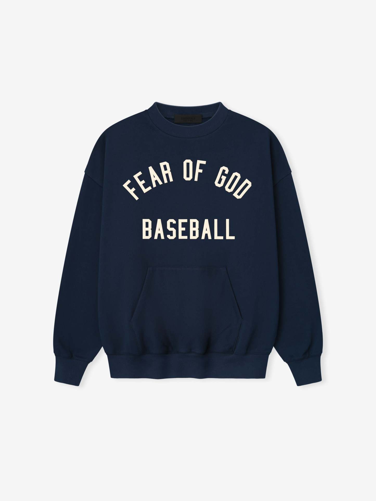 The MLB Sport Crewneck is crafted from core fleece, offering an elevated balance of softness, structure, and lasting comfort. Cut in a relaxed sport fit, it drapes with more ease through the body and extended length compared to the Essentials classic silhouette. The front features a bold puffer-print graphic reading “Fear of God Baseball”, while the back is finished with the "MLB Essentials" lockup. Additional details include a kangaroo pocket, rib-knit collar, cuffs and hem. The signature rubberized Fear of God Essentials label accents the hood.