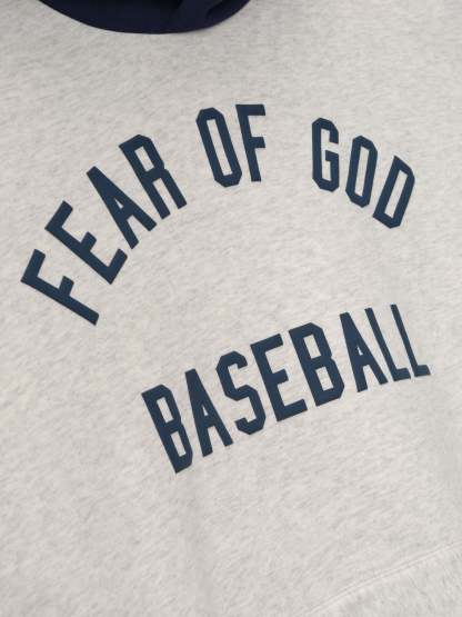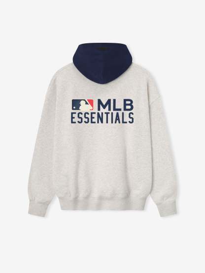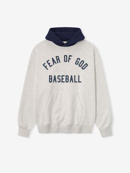 The MLB Sport Hoodie is crafted from core fleece, offering an elevated balance of softness, structure, and lasting comfort. Cut in a relaxed sport fit, it drapes with more ease through the body and extended length compared to the Essentials classic silhouette. The front features a bold puffer-print graphic reading "Fear of God Baseball" while the back is finished with a "MLB Essentials" lockup. Additional features include a contrasting double-layered hood, kangaroo pocket, rib-knit at the cuffs and waist hem. The signature rubberized Fear of God Essentials label accents the hood.