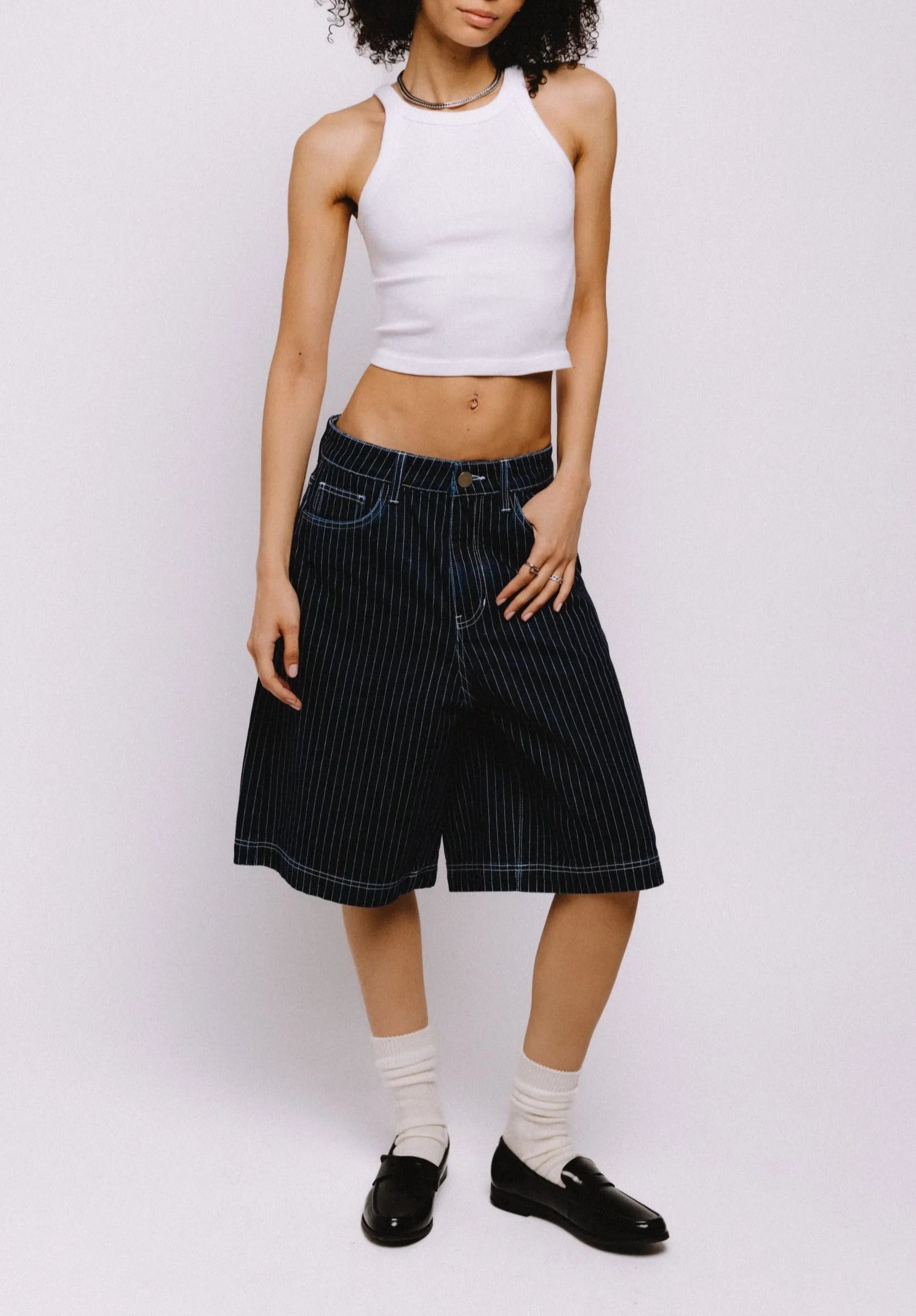 Our heavyweight pinstripe denim shorts feature a wide legged fit and boxy look. The pinstripe denim shorts feature our signature leather patch on the back belt line.