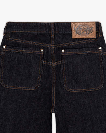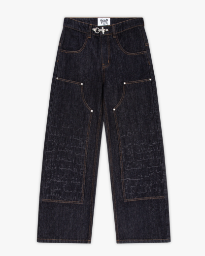 Crafted from selvedge-inspired denim, and defined by warm golden stitching and workwear-inspired carpenter panelling. The front panels carry a laser-etched Arabic poem that subtly fades into the raw denim, creating a quiet contrast between structure and script. Finished with a fireman hook clasp and oriental rug leather tab.