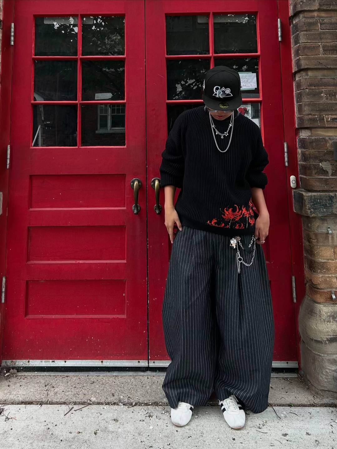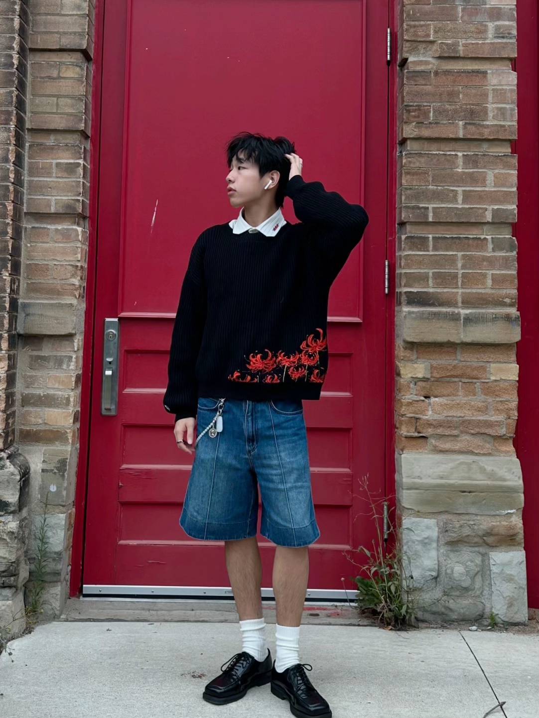 - Bold red floral embroidery pops on deep black knit.