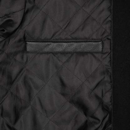wool fabric / 100% plain leather sleeves / polyester lining / ribbed hem and cuffs / embroidery on front and back / leather appliqué embroidery on front chest / with YKK zipper / fits true to size