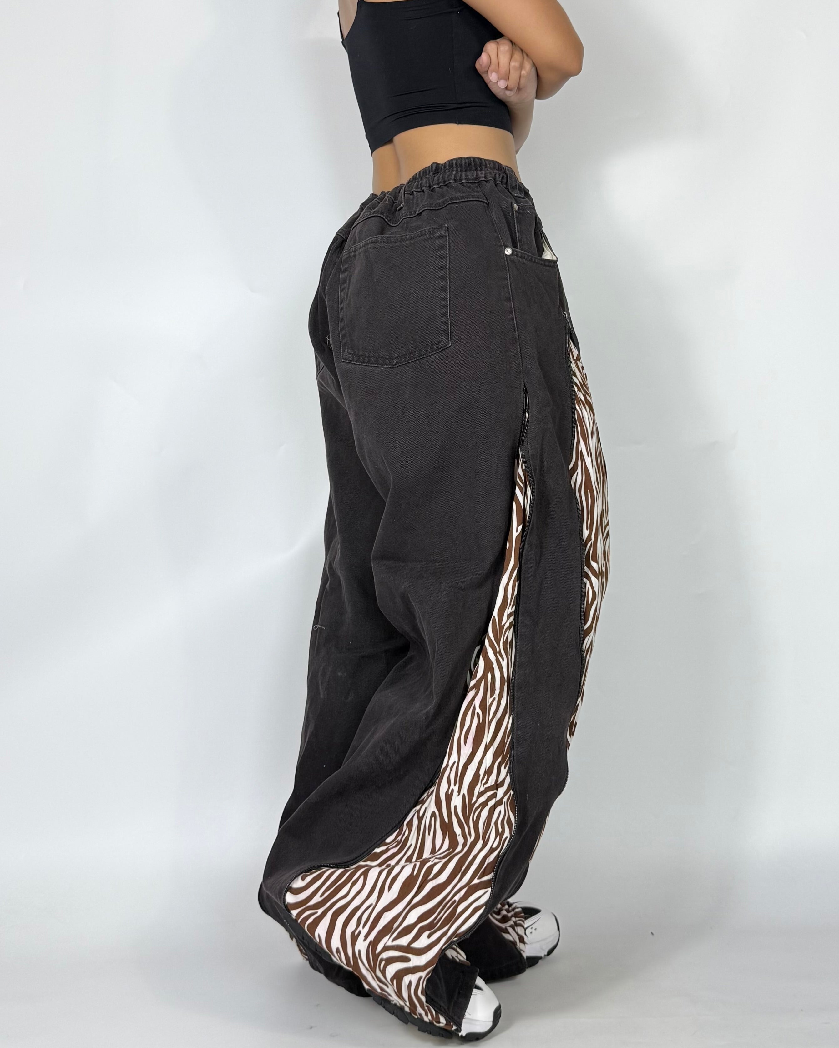 Jeans x Leopard– upcycled from 2 secondhand pairs with adjustable drawstring waist. One of a kind & unisex fit!