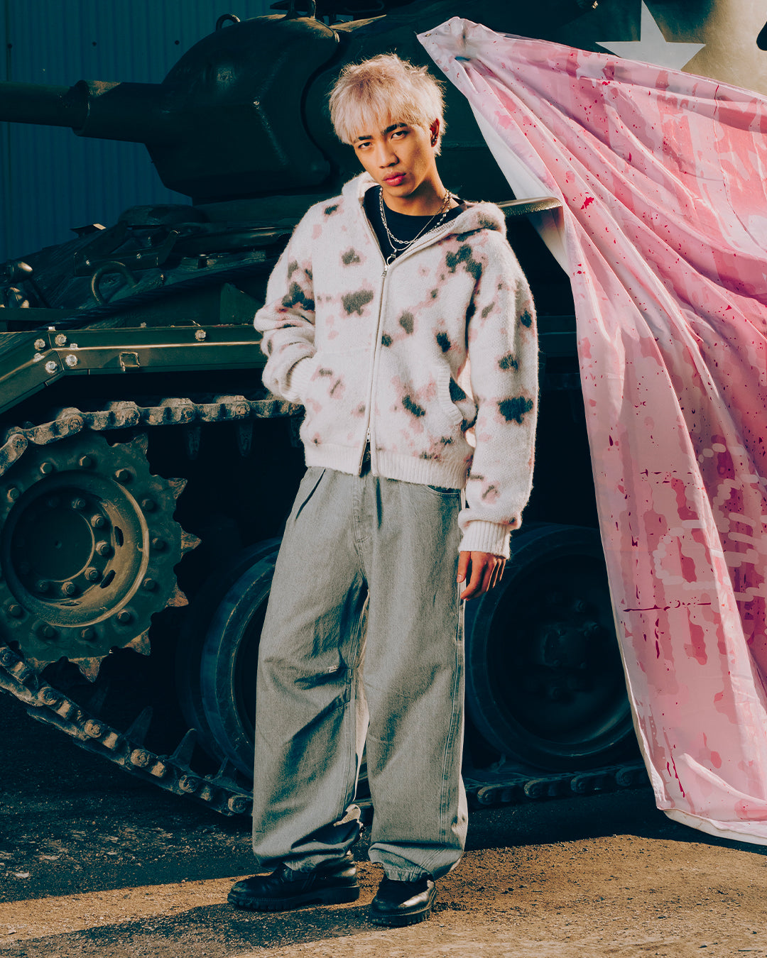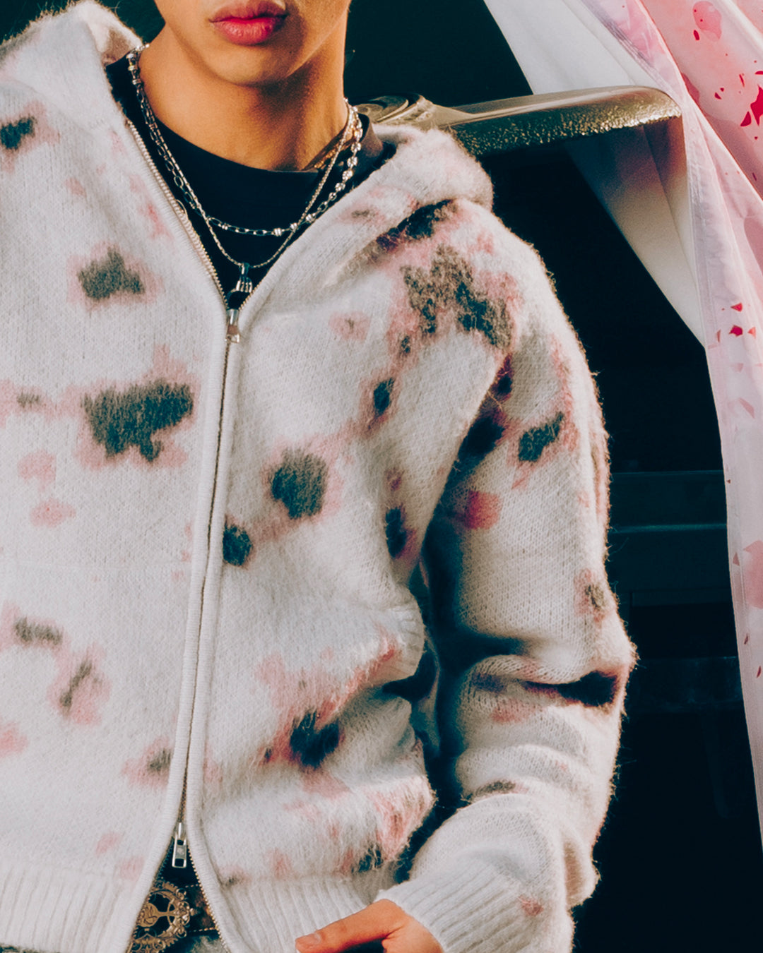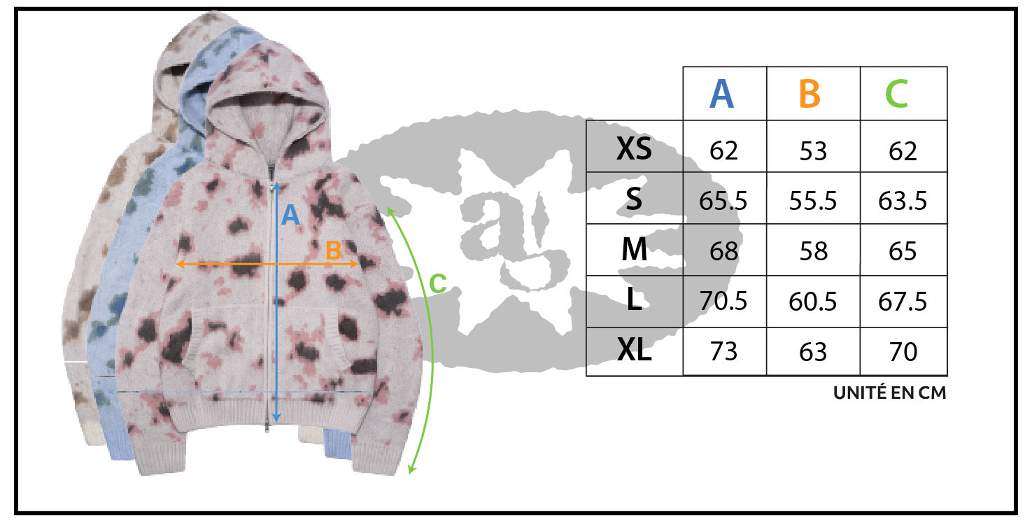 Confectionné dans notre usine partenaire en Chine, cette pièce présente un motif camouflage réinterprété, tricoté dans 3 nuances de couleurs, avec une composition fluffy qui apporte un léger flou au motif grâce aux fils.
