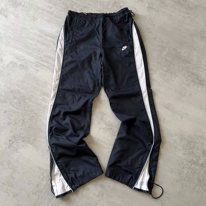 I pantaloni Nike degli anni 2000 rappresentano un'icona di stile sportivo e funzionalità, perfettamente in linea con l'estetica di quel decennio. Realizzati prevalentemente in tessuti tecnici come il nylon o il poliestere, si distinguono per il loro taglio ampio e rilassato, con elastici in vita e alle caviglie che ne accentuano la praticità. Spesso arricchiti da tasche laterali con zip e dettagli riflettenti, questi pantaloni incarnano lo spirito dello streetwear e dell'athleisure di quegli anni. I colori spaziano dal classico nero a tonalità più vivaci, con il logo Nike, ricamato o stampato sulla gamba, che aggiunge un tocco distintivo e riconoscibile.