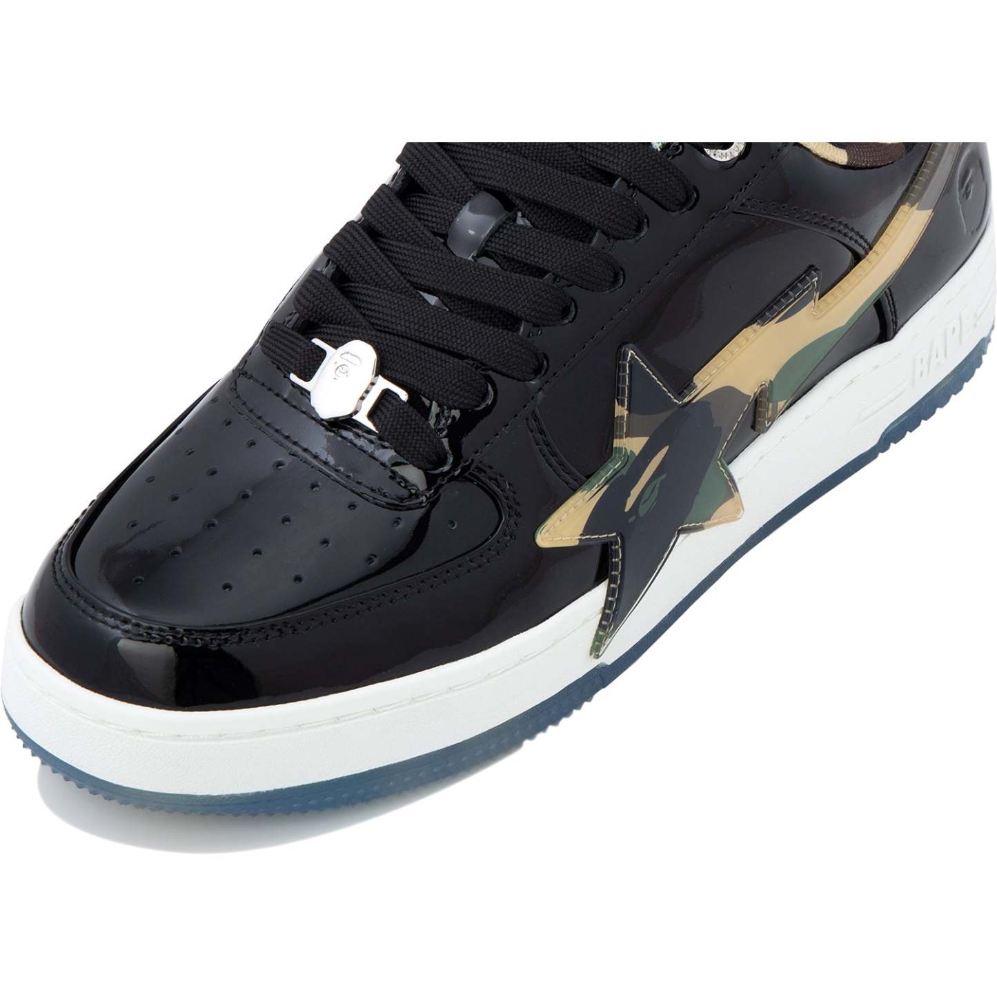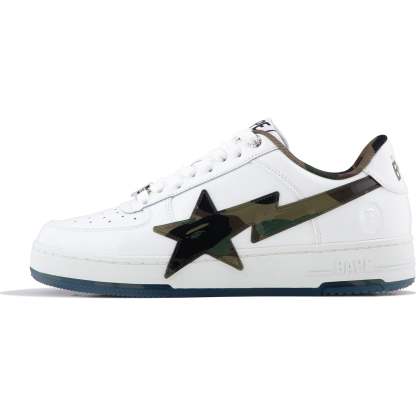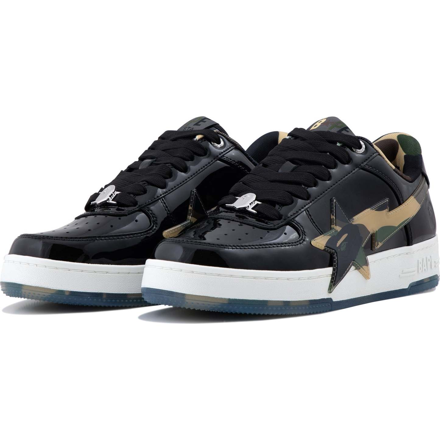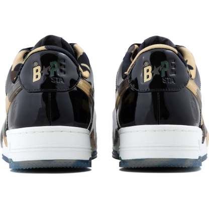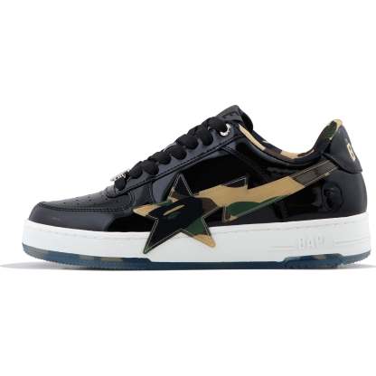 BAPE MENS STA OS #2 SNEAKER SHOE BY A BATHING APE. The BAPE STA OS returns with the legendary 1ST CAMO pattern, now glammed up! These kicks mix classic BAPE STA vibes with shiny patent leather for extra flair. The big, glossy STA logo decked out in CAMO steals the spotlight, while the outsole keeps the cool pattern going. Every stitch shows expert skill, perfect for anyone who digs bold details and city style. Available in classic black and white, these sneakers are made to turn heads.