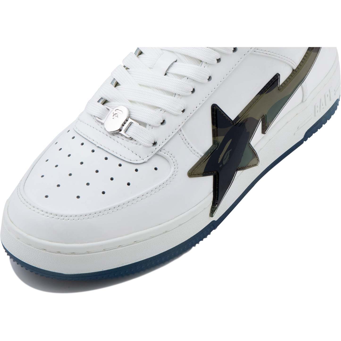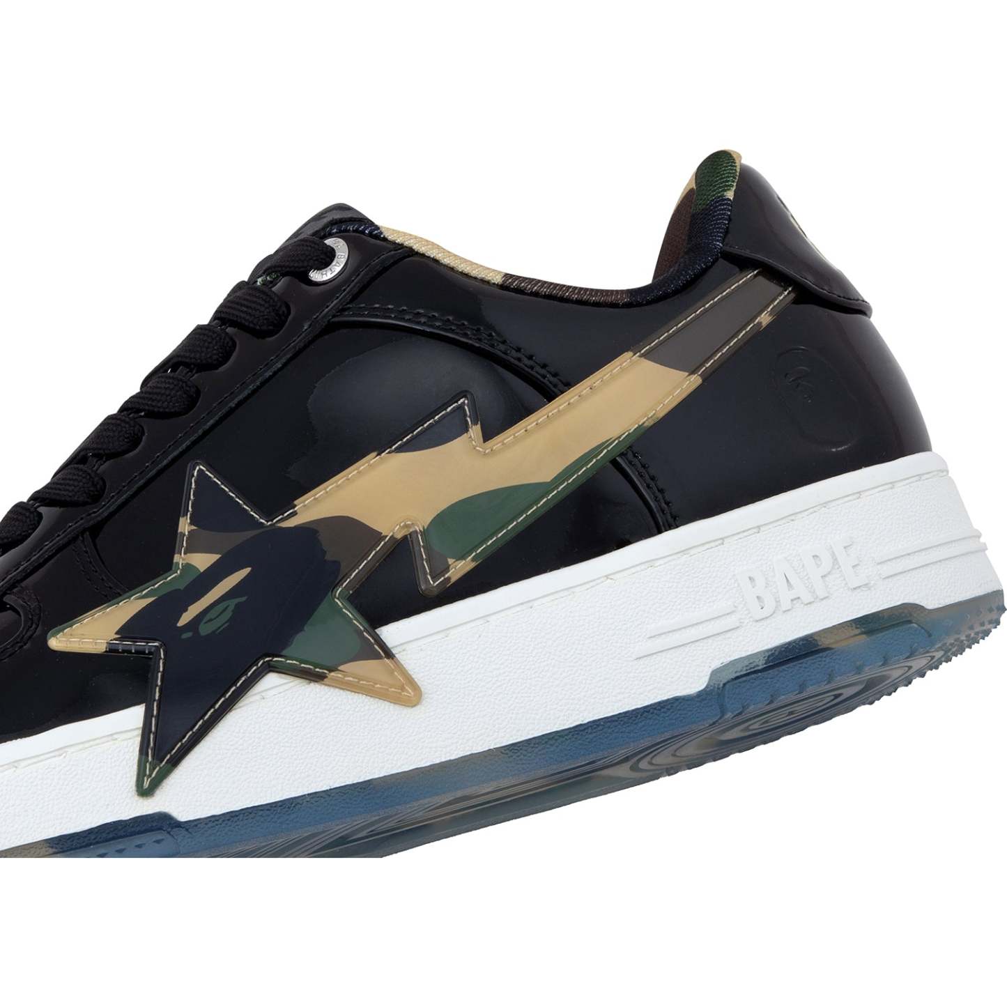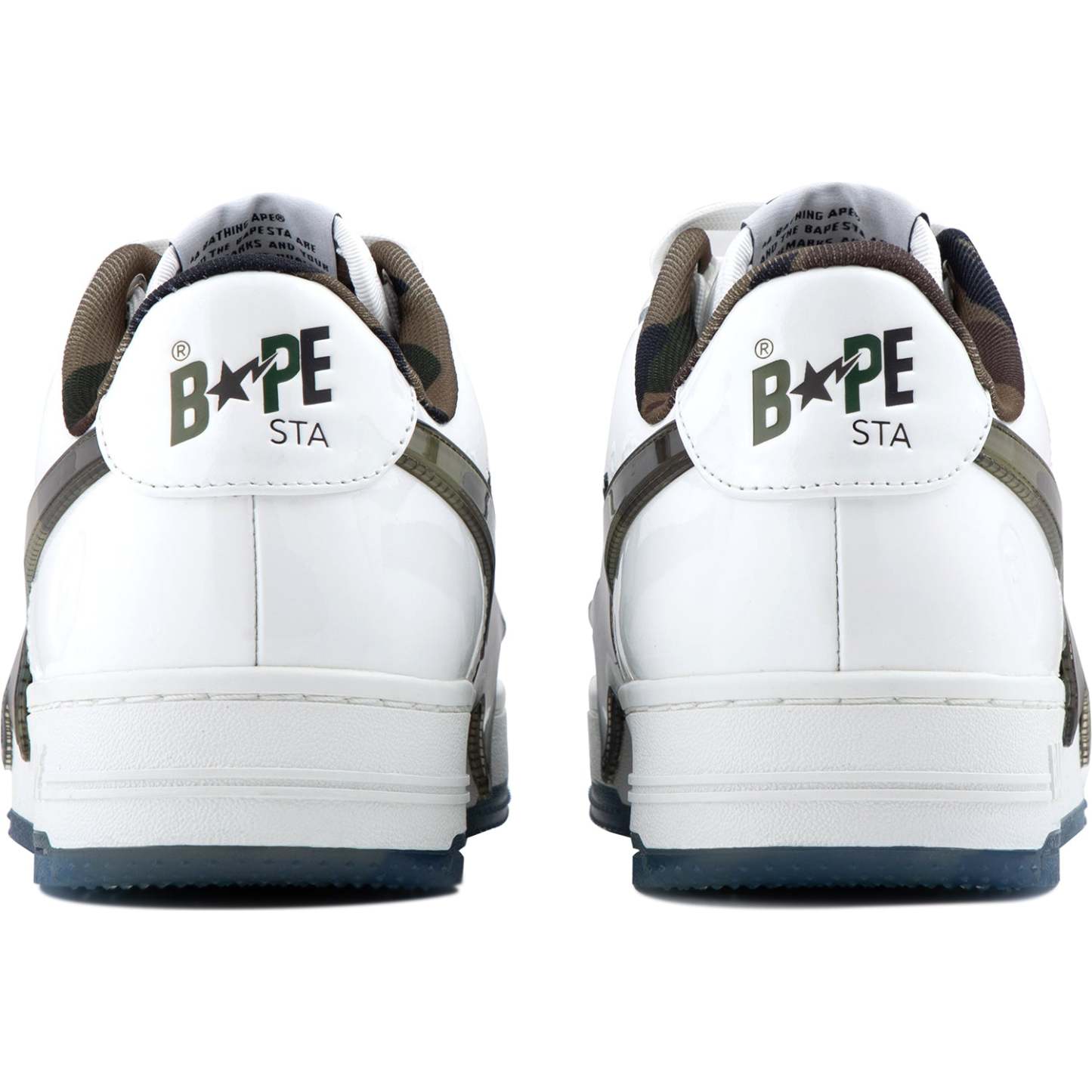 BAPE MENS STA OS #2 SNEAKER SHOE BY A BATHING APE. The BAPE STA OS returns with the legendary 1ST CAMO pattern, now glammed up! These kicks mix classic BAPE STA vibes with shiny patent leather for extra flair. The big, glossy STA logo decked out in CAMO steals the spotlight, while the outsole keeps the cool pattern going. Every stitch shows expert skill, perfect for anyone who digs bold details and city style. Available in classic black and white, these sneakers are made to turn heads.