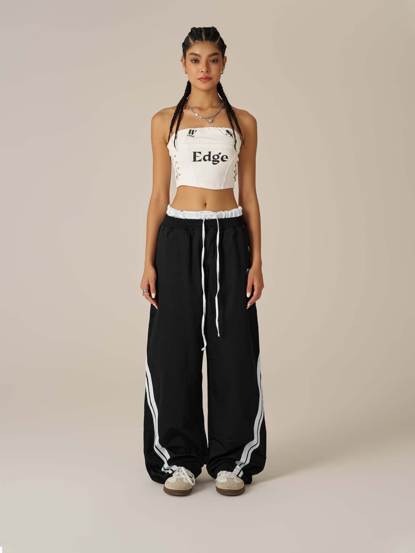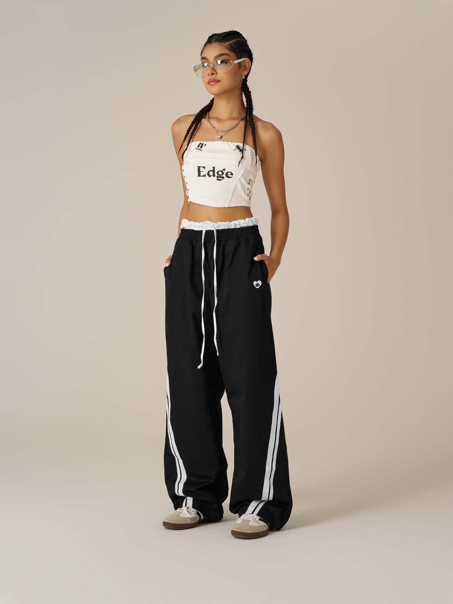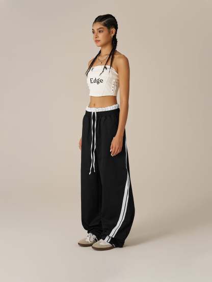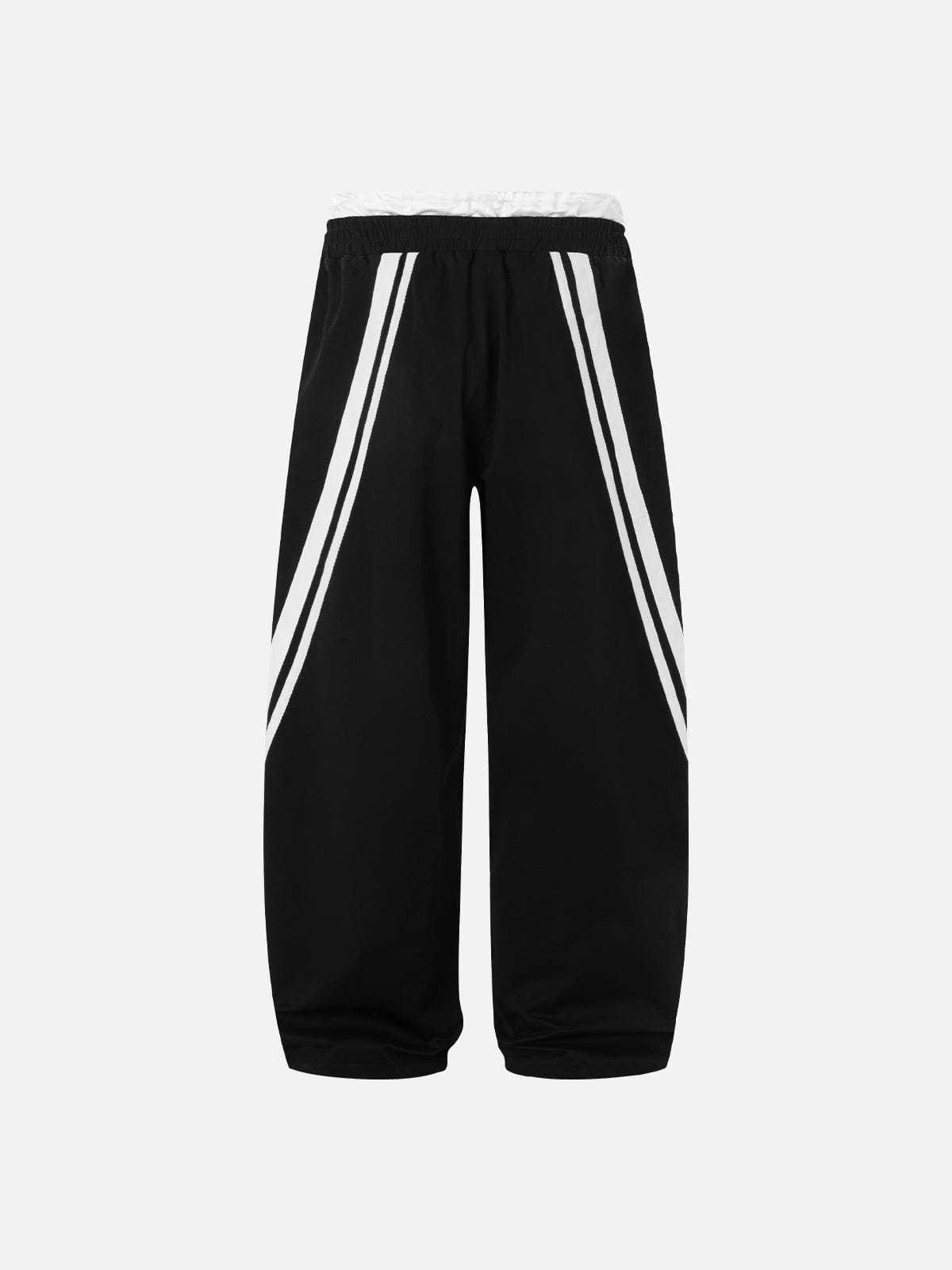 Step into layered detail with these black and white contrast sweatpants featuring a unique double waistband design. The illusion of two waistbands adds depth and attitude, while the bold monochrome blocking keeps the look sharp and graphic.