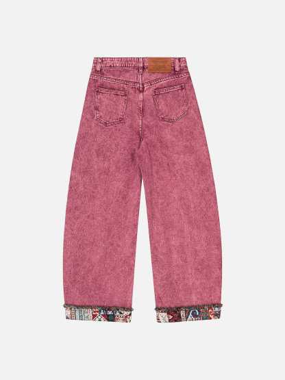 Distressed denim meets cultural heritage in these baggy barrel jeans — featuring hand-selected ethnic fabric patchwork, washed fading, and retro tones. Each pair tells a story with bold visual contrasts and one-of-a-kind personality that makes a statement without saying a word.