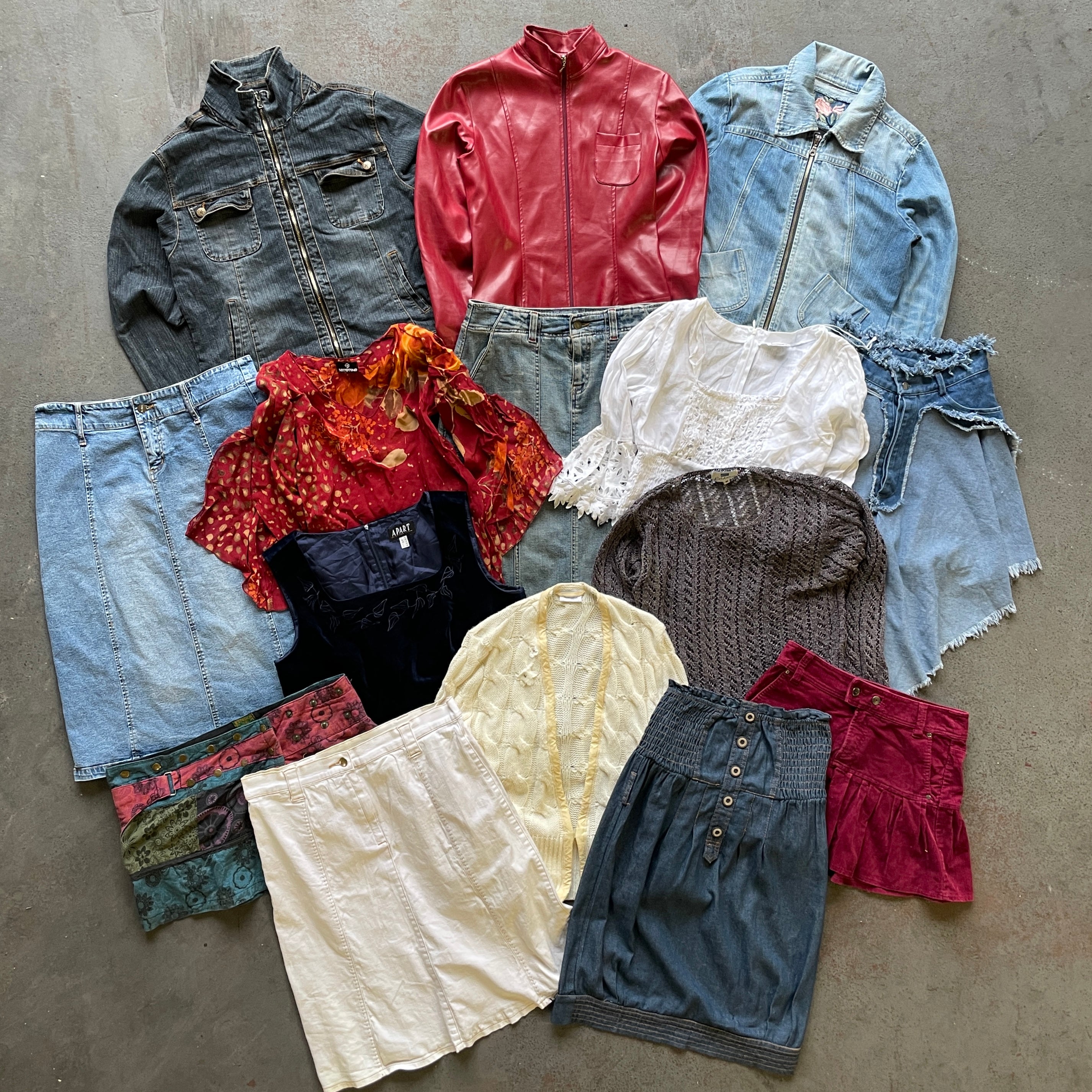 EACH BOX CONTAINS A CURATED ASSORTMENT OF VARIOUS LADIES Y2K STYLE PIECES. EXPECT A MIX OF LADIES DENIM AND FUR COATS, JEANS, SHORT AND LONG SKIRTS AS WELL AS CORSETS, TEES AND BLOUSES ETC.