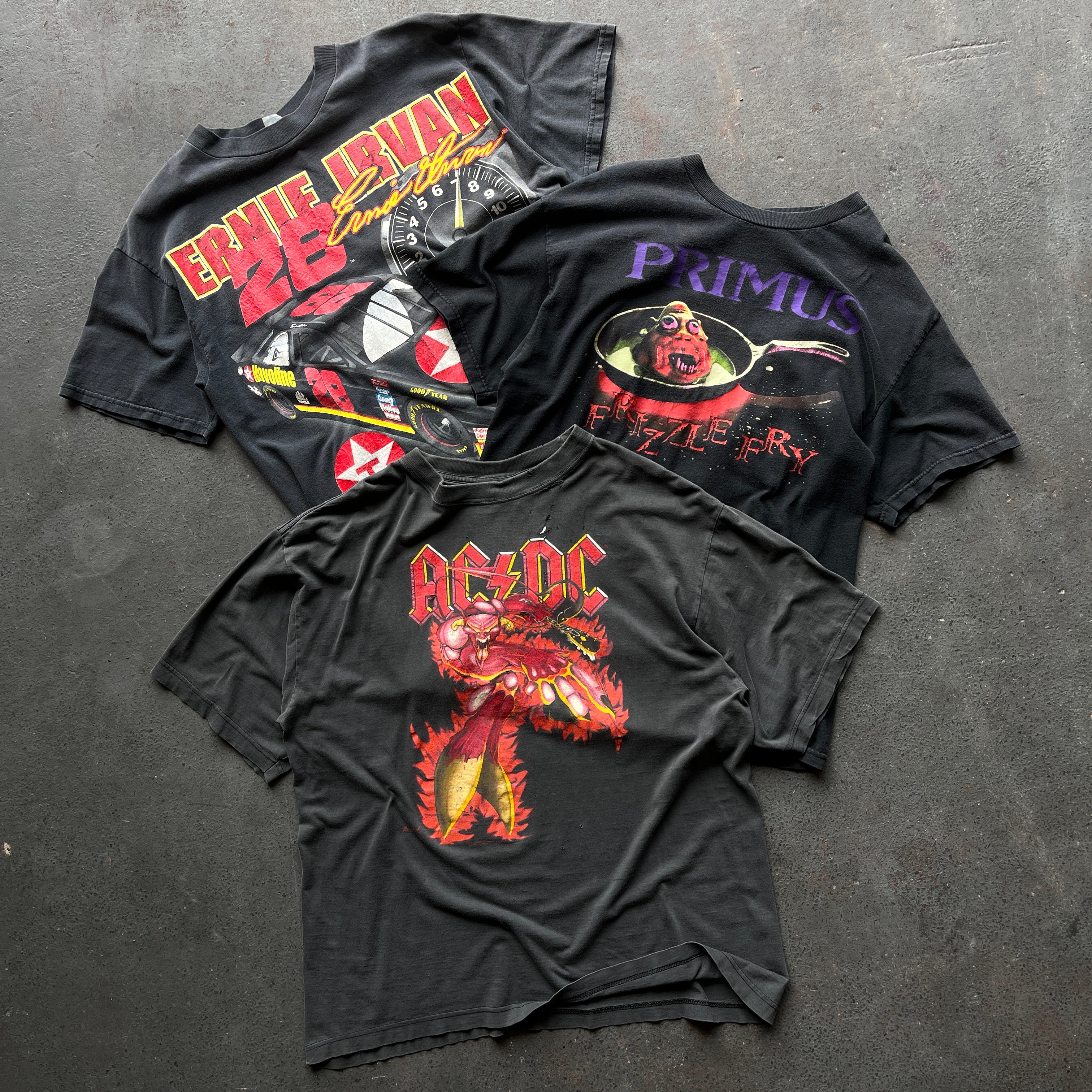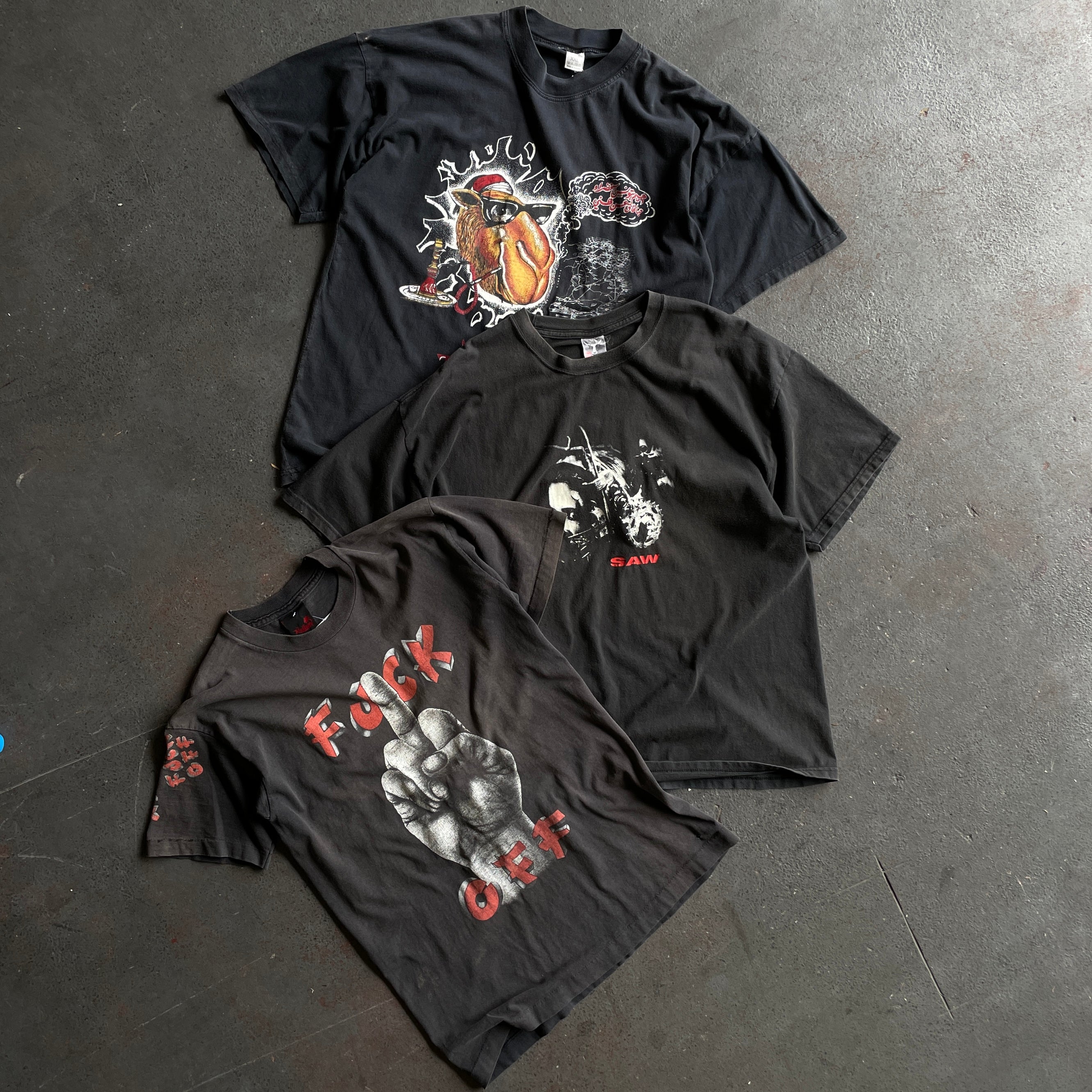 3 BLACK GRAPHIC VINTAGE T-SHIRTS, NO EXPLANATION NEEDED.